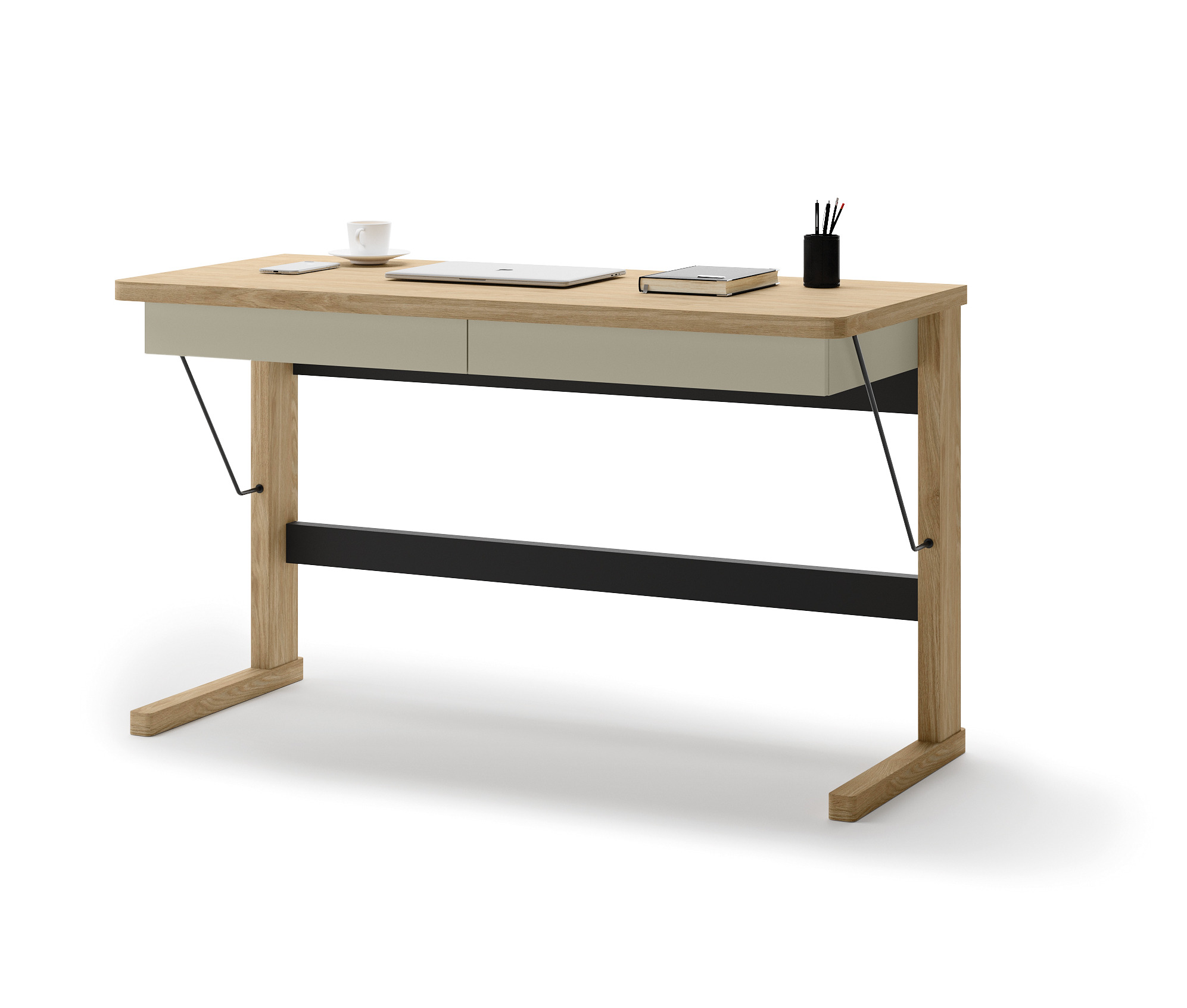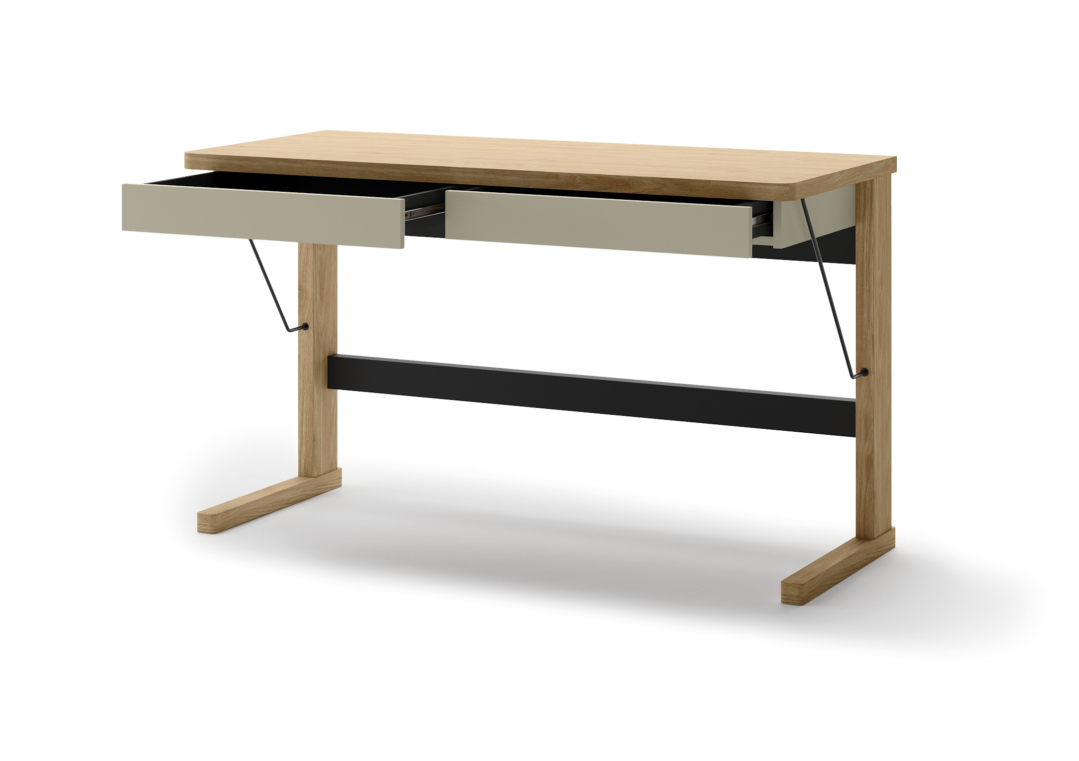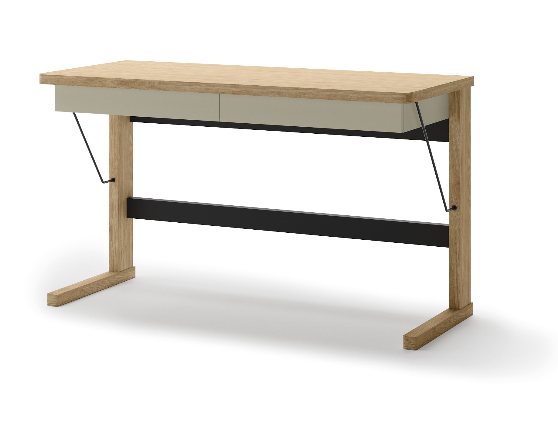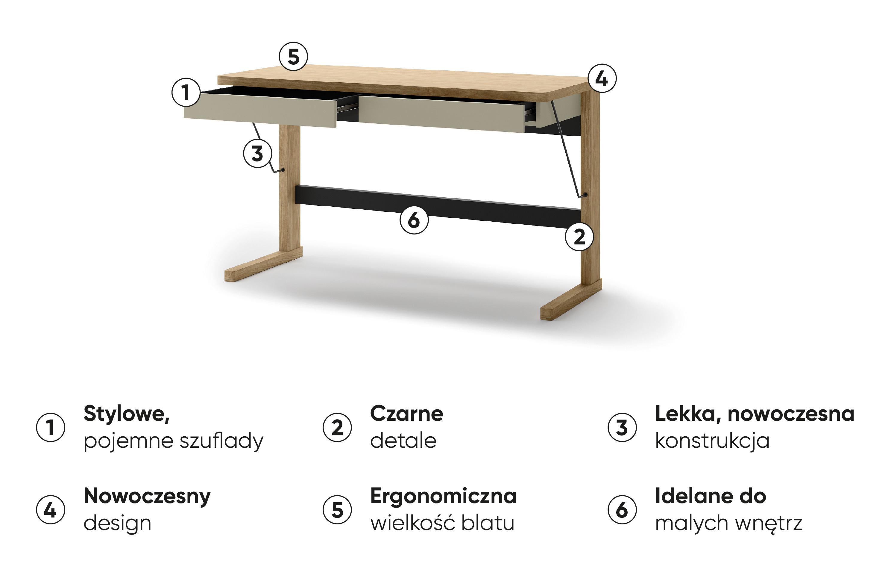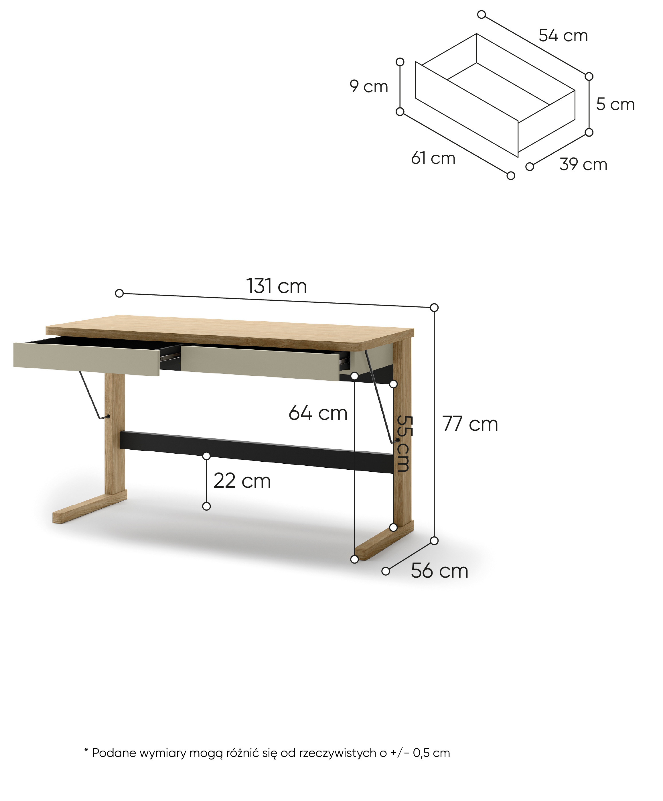 Biurko OLLIE OL-06 to eleganckie i praktyczne rozwiązanie do pracy w domu lub biurze. Szerokość 131 cm zapewnia wygodną przestrzeń roboczą, a dwie wysuwane szuflady umożliwiają przechowywanie dokumentów i akcesoriów. Solidny blat o grubości 32 mm podkreśla trwałość i estetykę mebla. Połączenie kolorów dąb, kaszmir i czerń nadaje biurku nowoczesny, wyrazisty charakter, który świetnie komponuje się z różnymi stylami wnętrz.