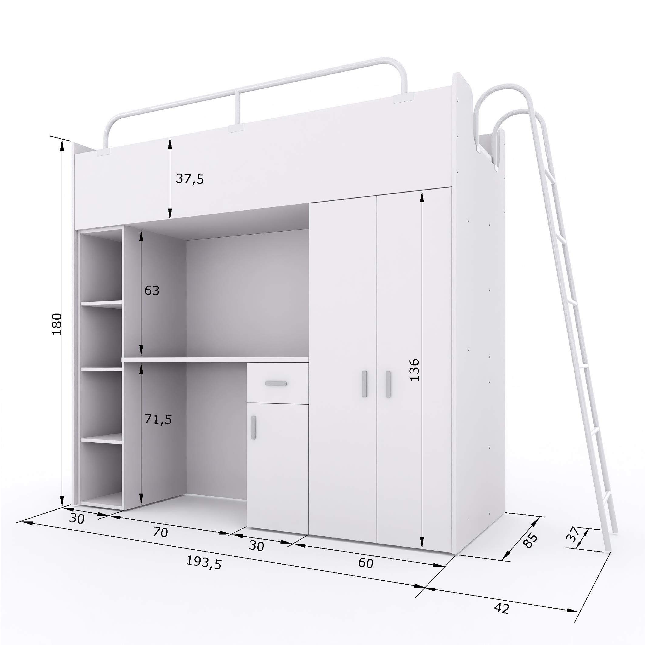 Łóżko piętrowe KIKI z biurkiem i drabinką to idealne rozwiązanie dla dzieci i młodzieży, które łączy w sobie funkcjonalność, wygodę i oszczędność miejsca. To wielozadaniowe mebel, który pozwala na optymalne wykorzystanie przestrzeni w pokoju. Na górnym poziomie znajduje się wygodne łóżko, zapewniające wyjątkowe miejsce do snu. Konstrukcja jest solidna i bezpieczna, z barierkami zabezpieczającymi przed przypadkowym wypadnięciem. Poniżej łóżka znajduje się przestronne biurko, idealne do nauki, pracy lub twórczych zajęć. Biurko jest wyposażone w praktyczne półki i schowki, aby utrzymać porządek i przechowywać niezbędne przedmioty. Drabinka zamontowana po boku łóżka umożliwia bezpieczne wchodzenie i schodzenie z górnego poziomu. Została zaprojektowana tak, aby być stabilna i wygodna w użyciu, a jednocześnie nie zajmować zbyt wiele miejsca.