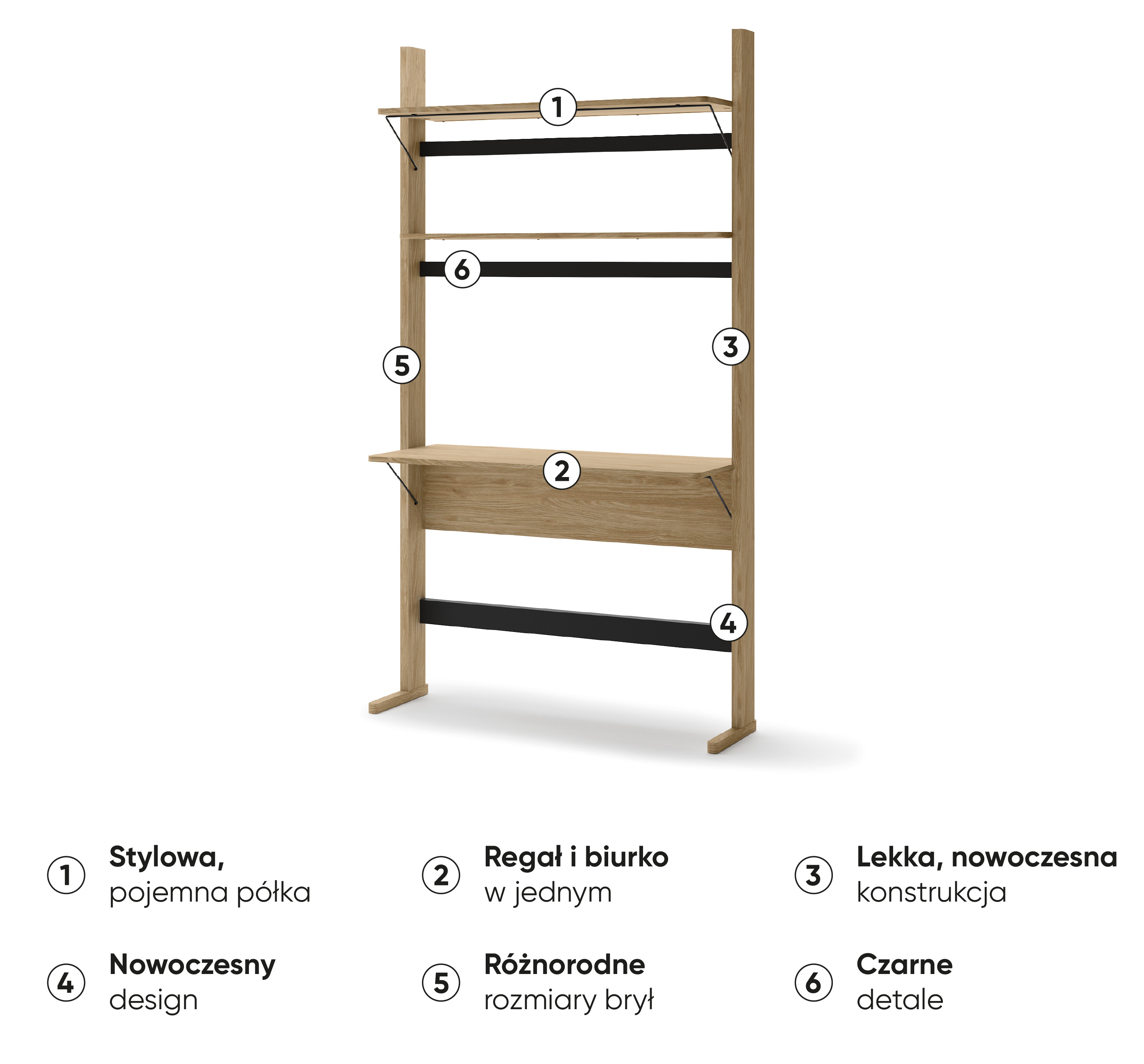 OLLIE OL-04 to praktyczne i stylowe połączenie regału z biurkiem, które doskonale sprawdzi się w domowym biurze, pokoju młodzieżowym czy salonie. Kompaktowy blat o głębokości 40 cm oferuje wystarczająco dużo miejsca na laptopa, notatki i niezbędne akcesoria, zapewniając komfortową przestrzeń do codziennej pracy. Pogrubiony do 32 mm blat dodaje całości elegancji i zwiększa trwałość mebla. Zintegrowany regał wyposażony jest w dwie praktyczne półki, które pomogą uporządkować dokumenty, książki lub dekoracje. Całość została wykonana z trwałej płyty laminowanej w naturalnym, ciepłym odcieniu dębu, wprowadzając do wnętrza przytulny i harmonijny klimat. OLLIE OL-04 to idealne rozwiązanie dla osób ceniących estetykę, ergonomię i funkcjonalność w jednym meblu.