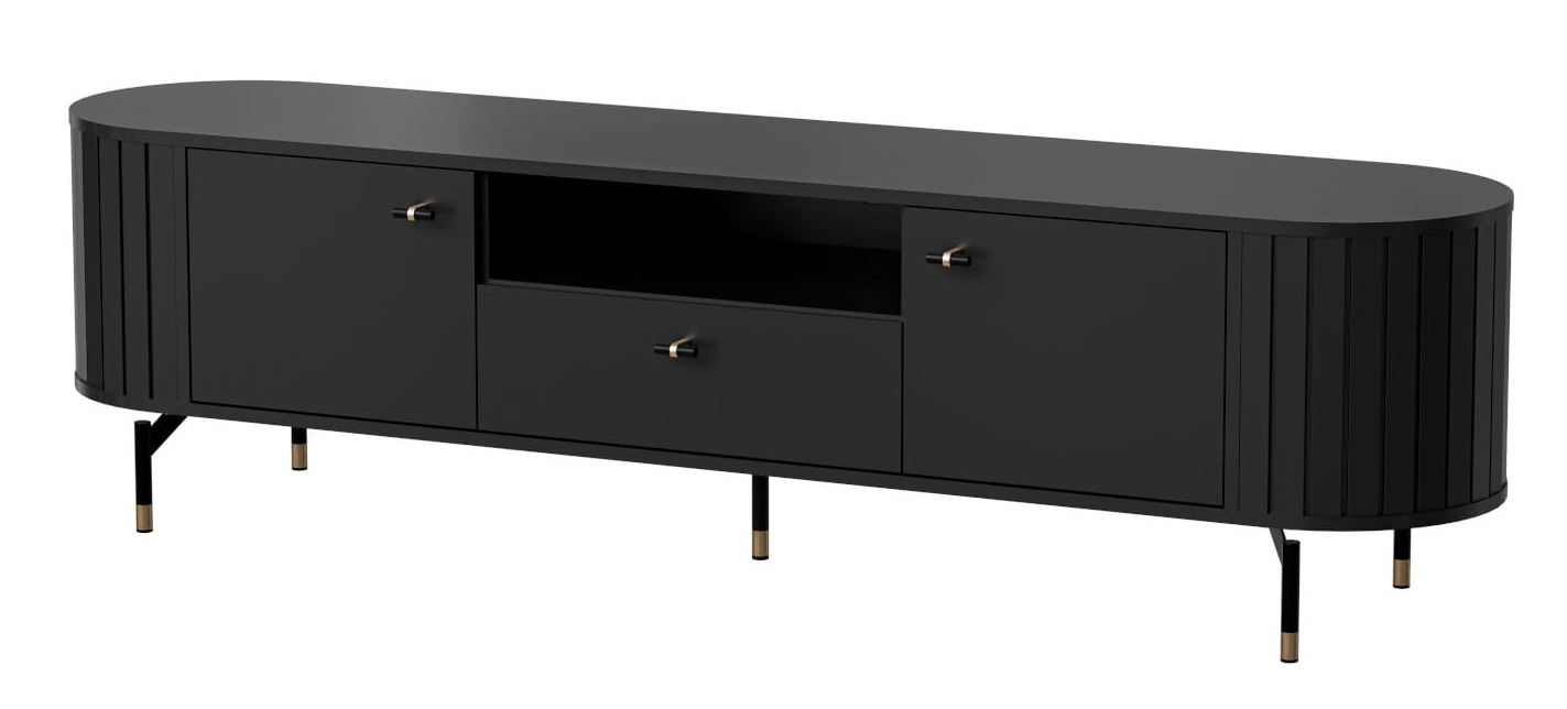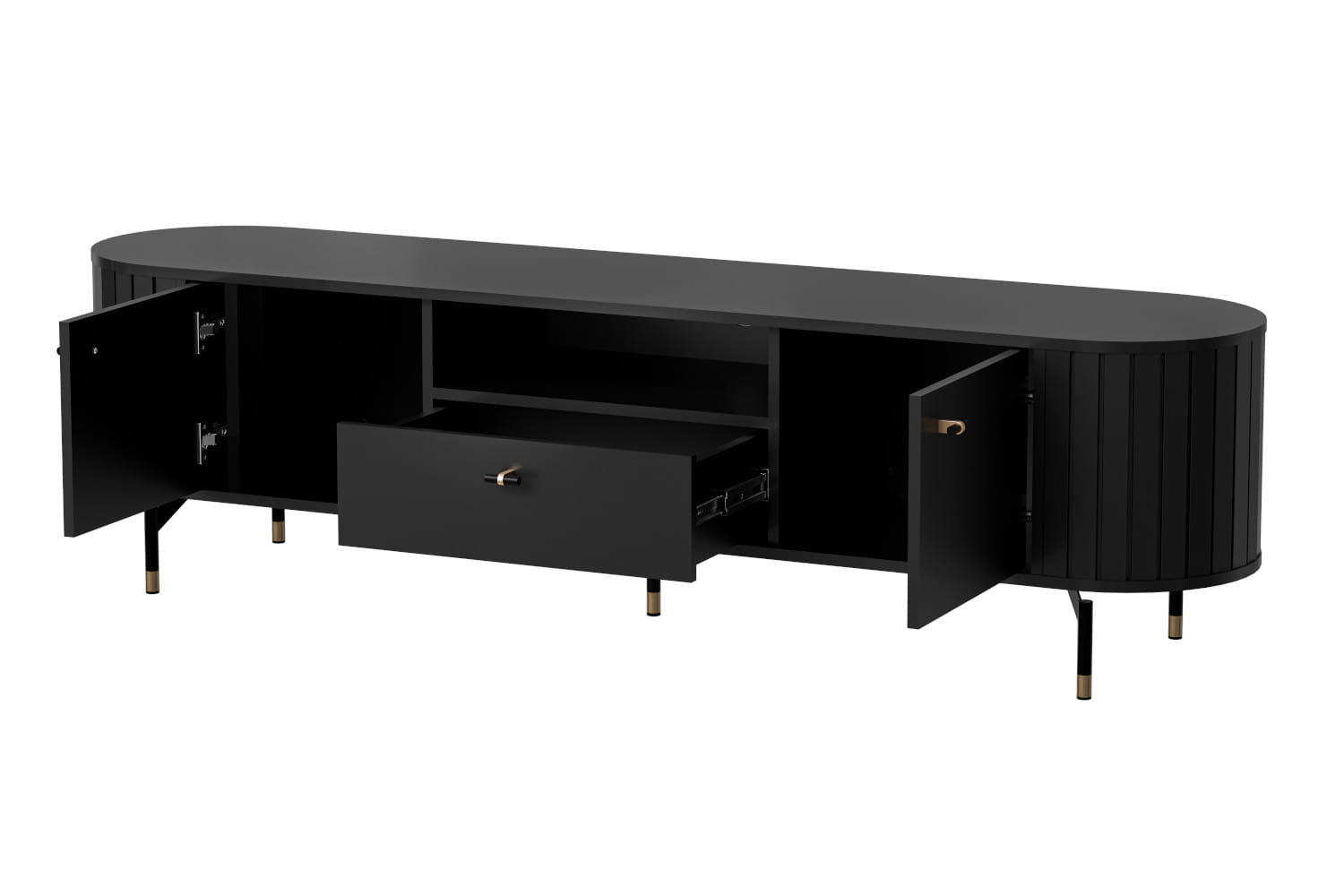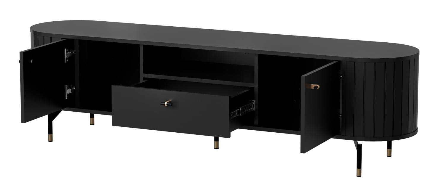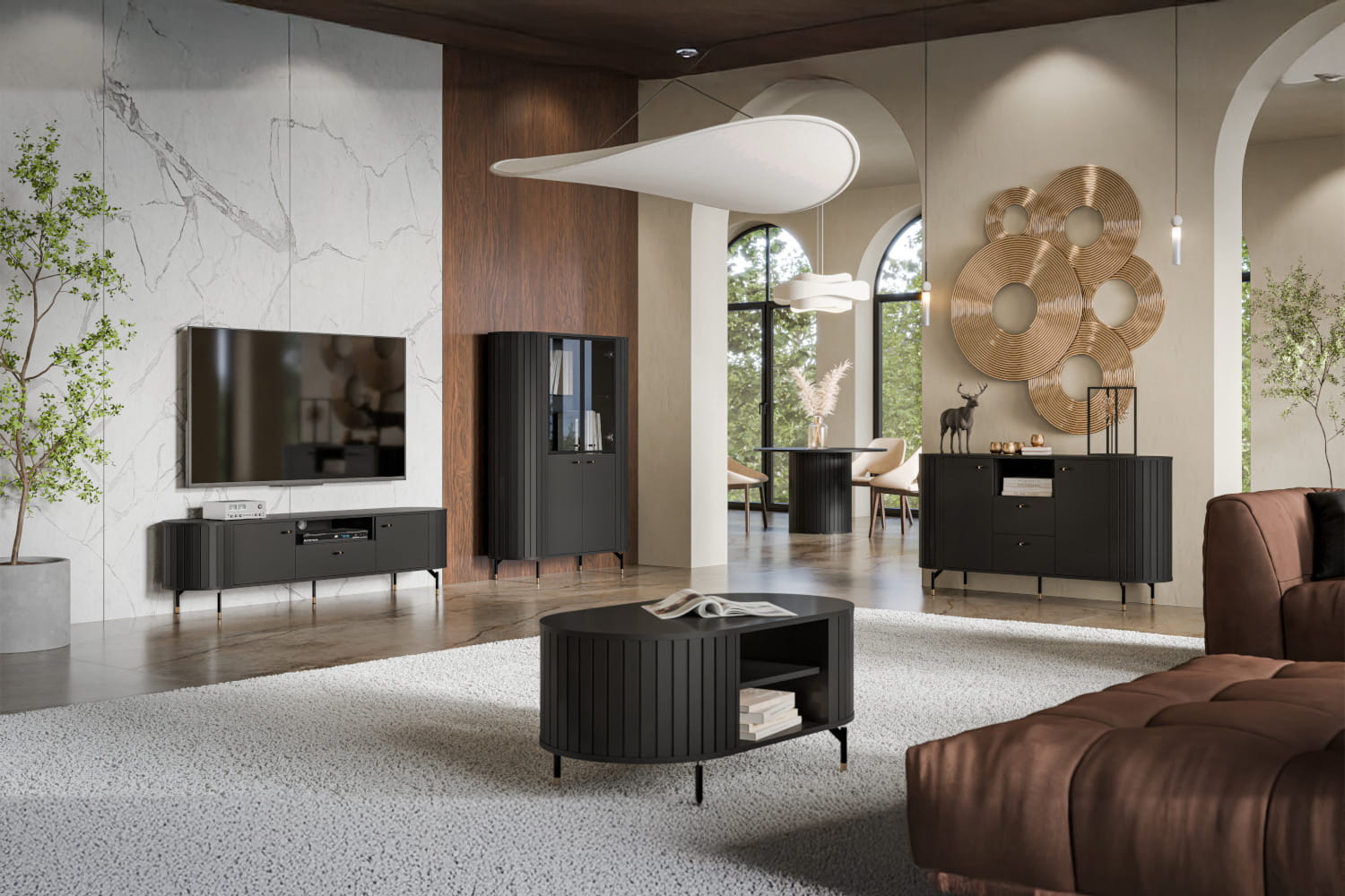 Szafka RTV z kolekcji ZANTE to harmonijne połączenie ponadczasowego stylu retro z praktycznymi rozwiązaniami na miarę współczesnych wnętrz. Charakterystyczne zaokrąglone kształty, eleganckie ryflowane fronty oraz smukłe, metalowe nóżki nadają meblowi lekkości i wyrafinowanego wyglądu. Zaprojektowana z myślą o funkcjonalności, oferuje przestronne wnętrze na sprzęt multimedialny, dekodery, konsole czy kolekcję płyt. Przemyślany układ półek i zamykanych szafek pozwala zachować porządek i estetykę wokół strefy telewizyjnej. Dostępna w dwóch eleganckich wersjach kolorystycznych – głębokiej czerni i subtelnym kaszmirze – szafka RTV ZANTE doskonale wpisuje się w różne style aranżacyjne, od klasycznych po nowoczesne.