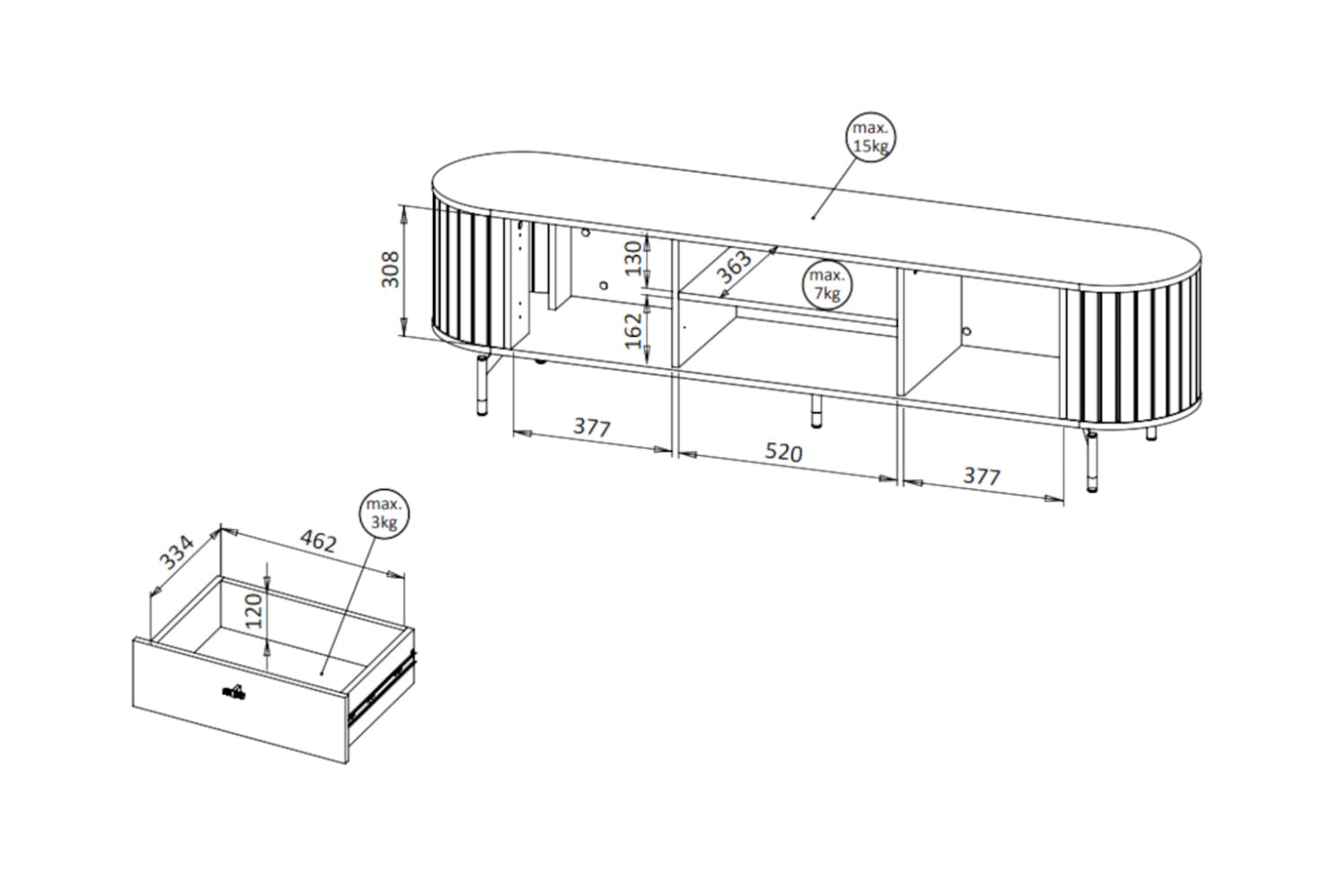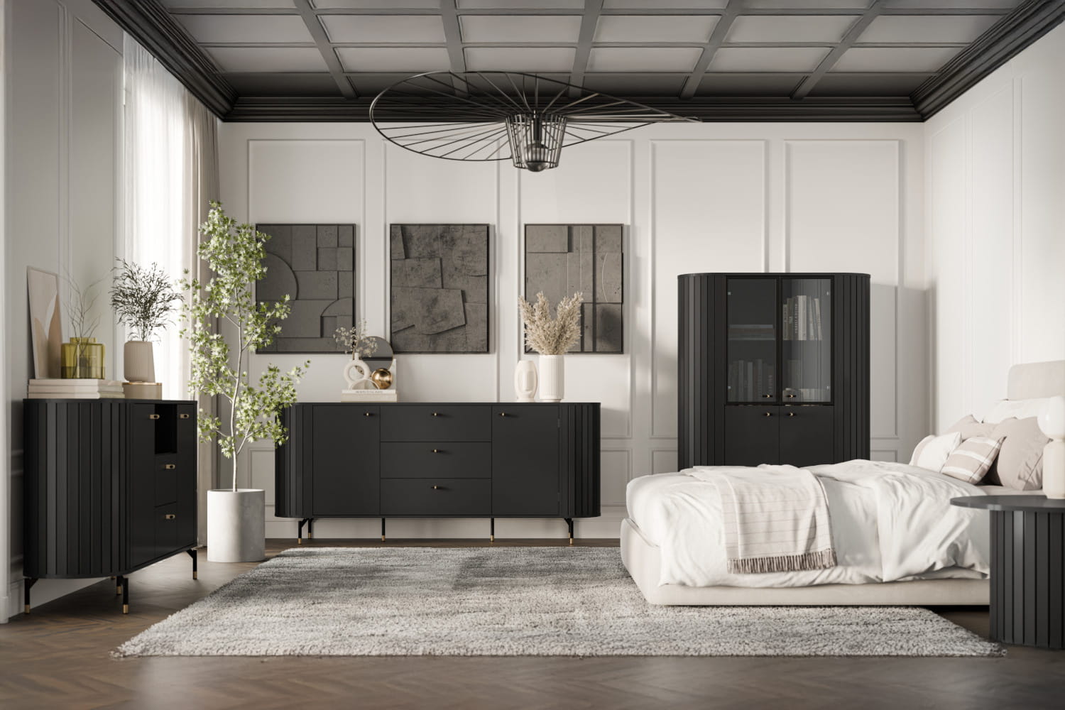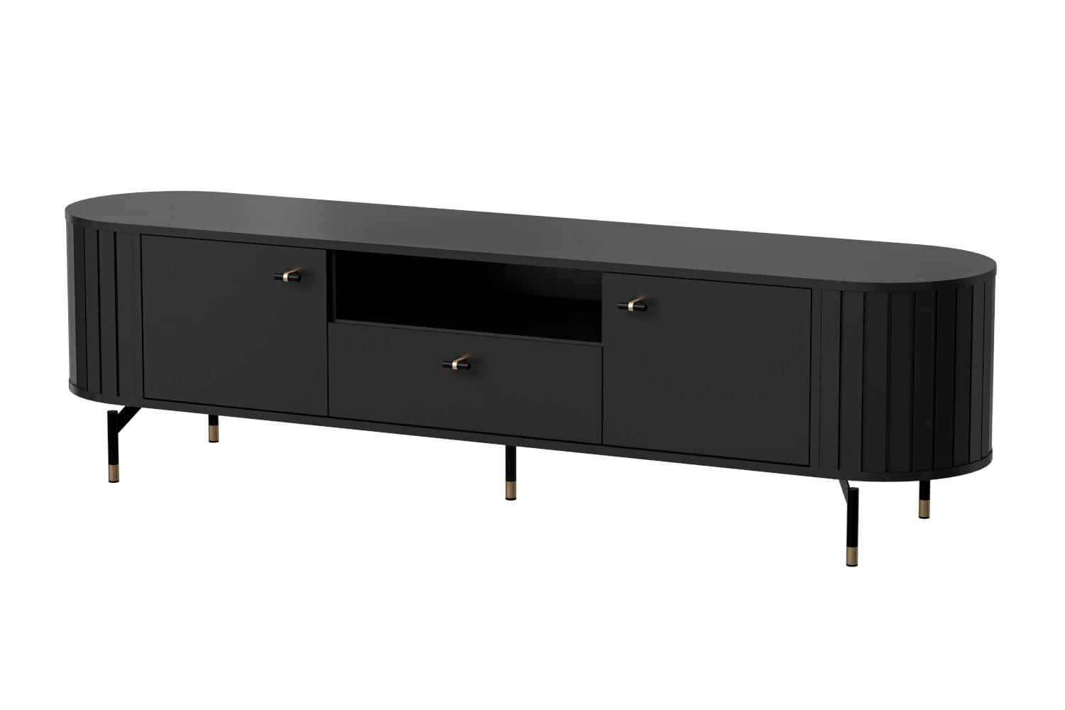 Szafka RTV z kolekcji ZANTE to harmonijne połączenie ponadczasowego stylu retro z praktycznymi rozwiązaniami na miarę współczesnych wnętrz. Charakterystyczne zaokrąglone kształty, eleganckie ryflowane fronty oraz smukłe, metalowe nóżki nadają meblowi lekkości i wyrafinowanego wyglądu. Zaprojektowana z myślą o funkcjonalności, oferuje przestronne wnętrze na sprzęt multimedialny, dekodery, konsole czy kolekcję płyt. Przemyślany układ półek i zamykanych szafek pozwala zachować porządek i estetykę wokół strefy telewizyjnej. Dostępna w dwóch eleganckich wersjach kolorystycznych – głębokiej czerni i subtelnym kaszmirze – szafka RTV ZANTE doskonale wpisuje się w różne style aranżacyjne, od klasycznych po nowoczesne.