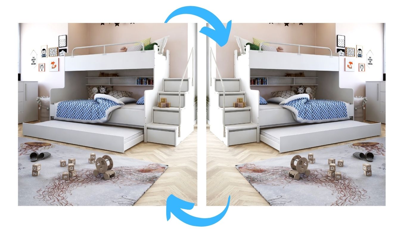 Schodki mogą być ustawione równolegle lub prostopadle do korpusu łóżka (podczas montażu to klient decyduje o ustawieniu schodków)