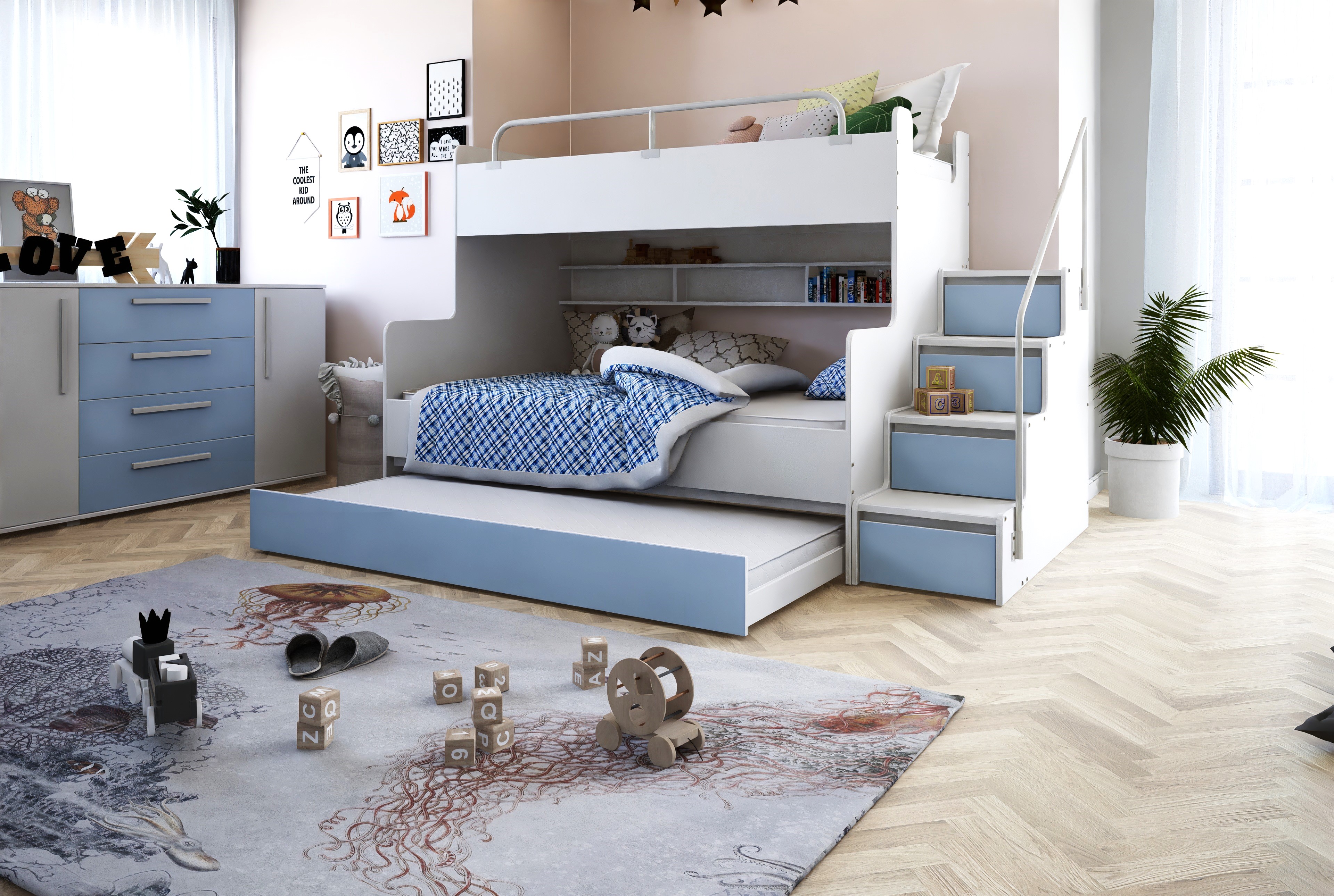 Łóżko piętrowe KIKI3 z dodatkowym spaniem to wszechstronny i funkcjonalny mebel, który doskonale odpowiada na potrzeby nowoczesnej dziecięcej lub młodzieżowej sypialni. Zaprojektowane z myślą o codziennym komforcie i estetyce, łączy wygodne miejsca do spania z praktycznymi rozwiązaniami do przechowywania. Solidna konstrukcja zapewnia bezpieczeństwo, a możliwość wyboru strony schodków ułatwia dopasowanie łóżka do każdego wnętrza. Wbudowane półki przy dolnym łóżku oferują miejsce na książki, zabawki i inne drobiazgi, które warto mieć pod ręką.
