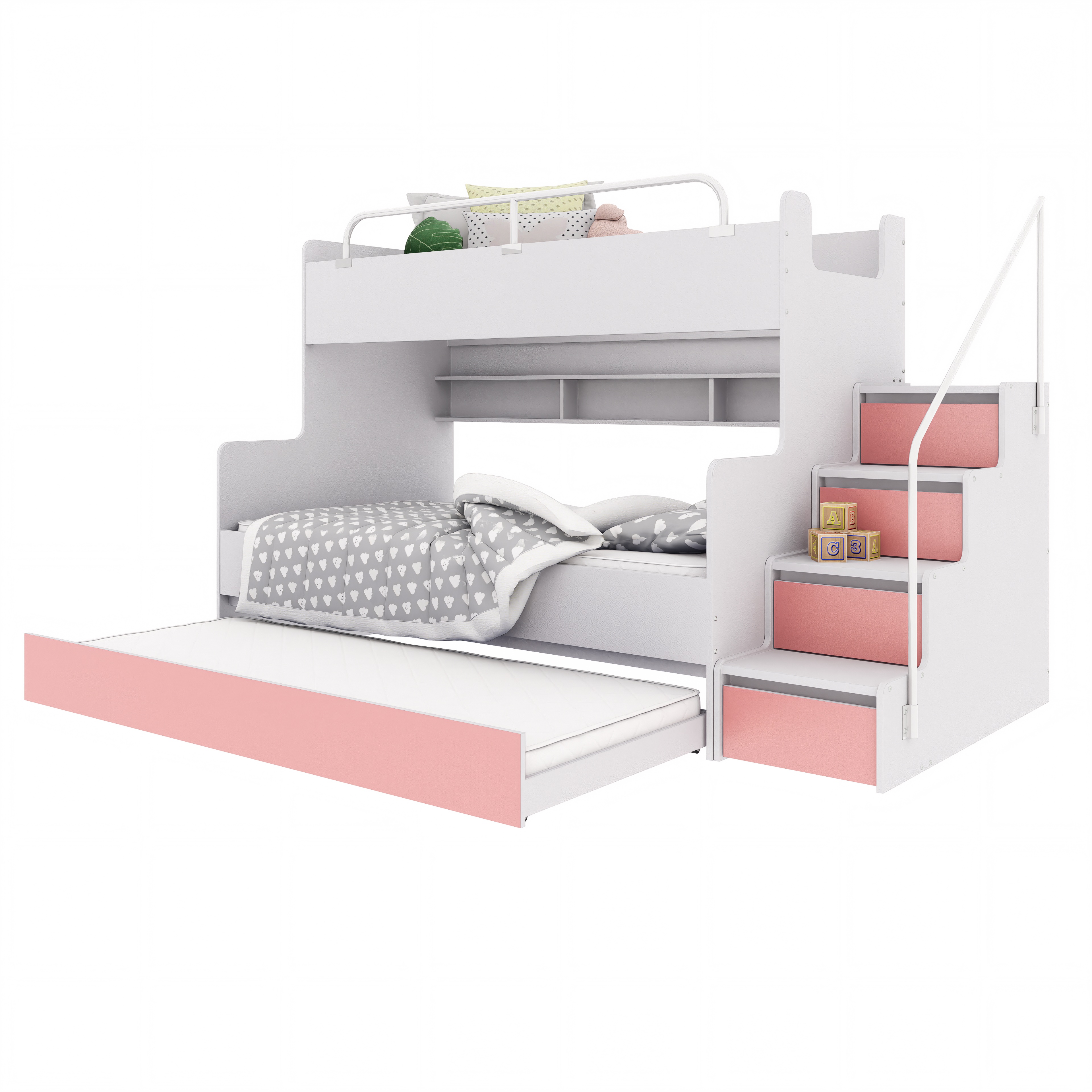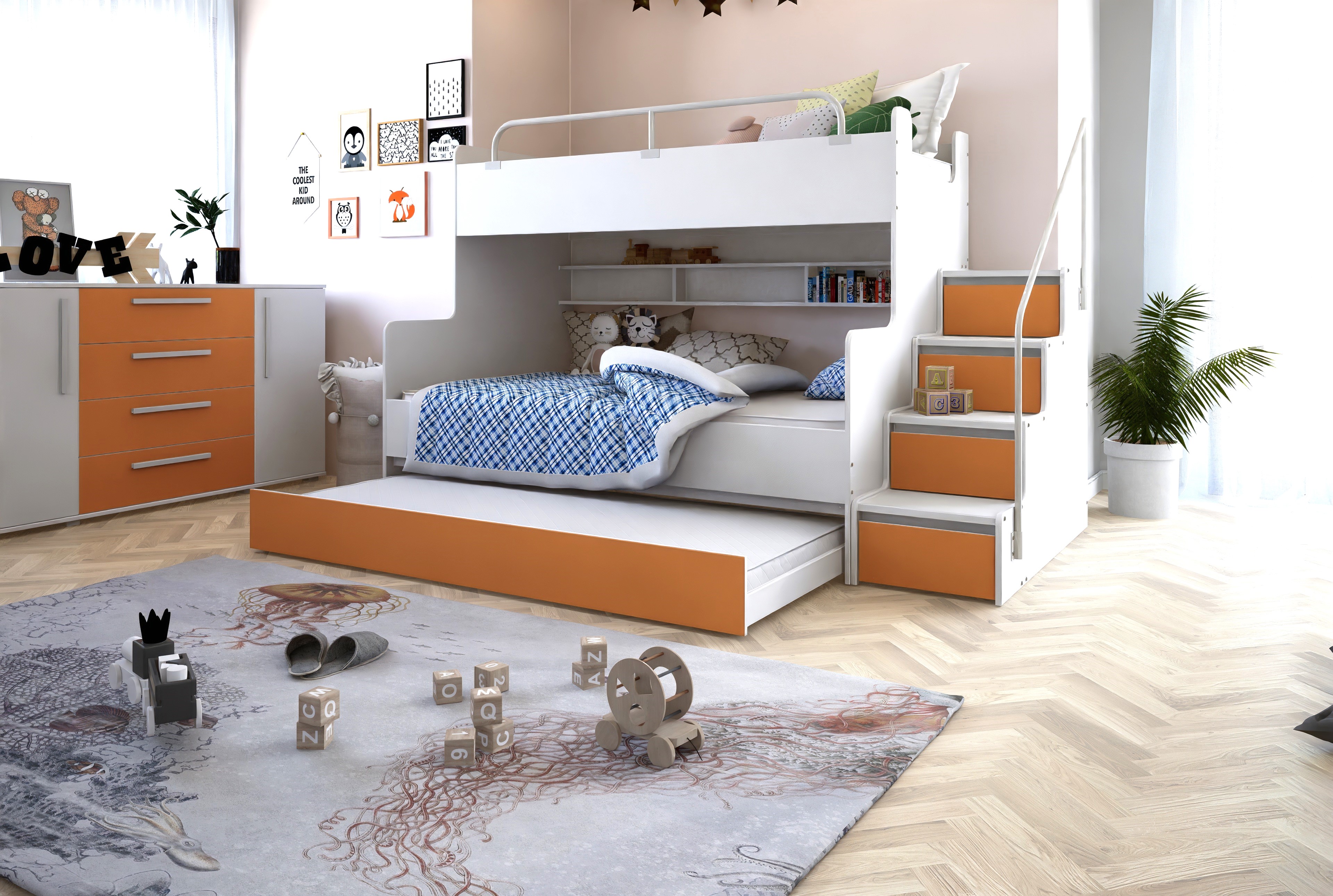 Łóżko piętrowe KIKI3 z dodatkowym spaniem to wszechstronny i funkcjonalny mebel, który doskonale odpowiada na potrzeby nowoczesnej dziecięcej lub młodzieżowej sypialni. Zaprojektowane z myślą o codziennym komforcie i estetyce, łączy wygodne miejsca do spania z praktycznymi rozwiązaniami do przechowywania. Solidna konstrukcja zapewnia bezpieczeństwo, a możliwość wyboru strony schodków ułatwia dopasowanie łóżka do każdego wnętrza. Wbudowane półki przy dolnym łóżku oferują miejsce na książki, zabawki i inne drobiazgi, które warto mieć pod ręką.