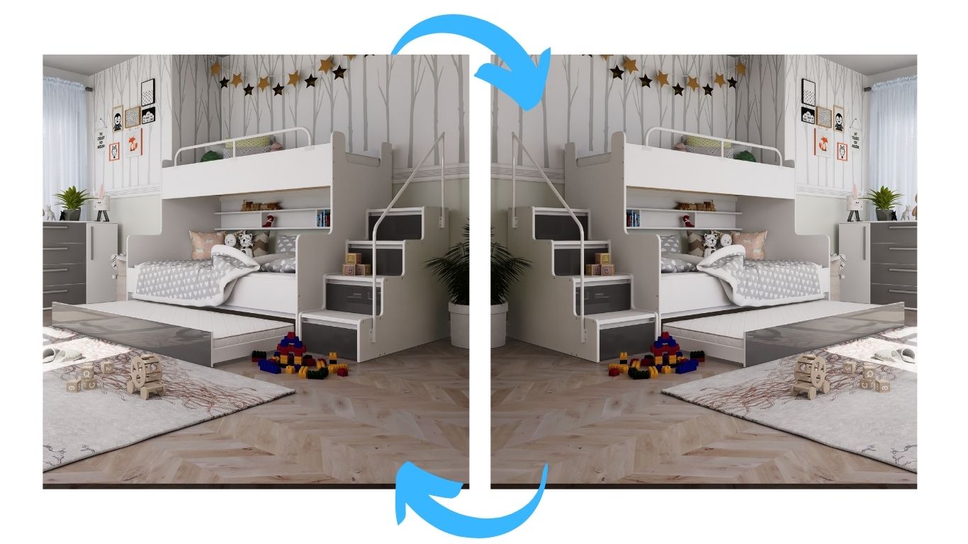 Schodki mogą być ustawione równolegle lub prostopadle do korpusu łóżka (podczas montażu to klient decyduje o ustawieniu schodków)