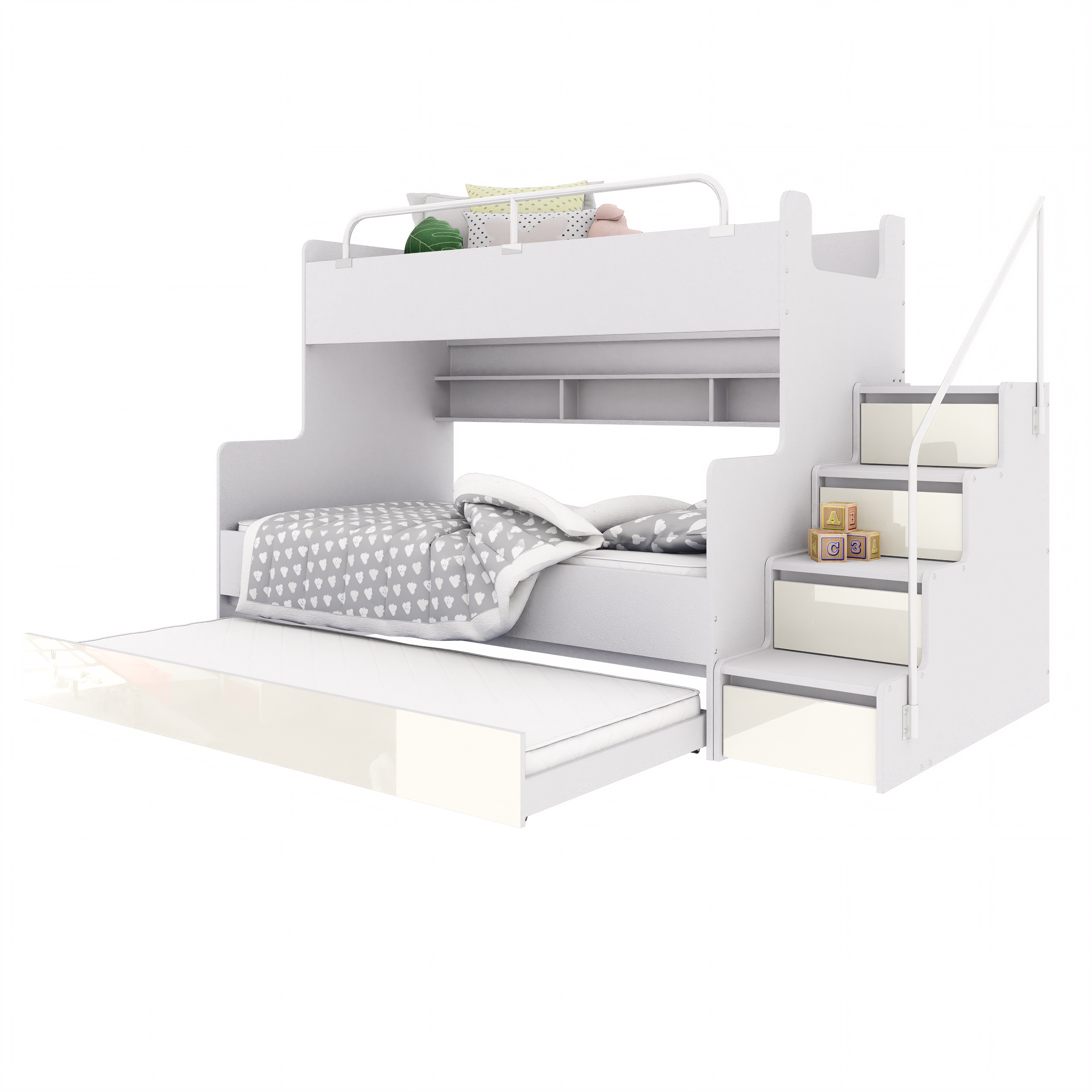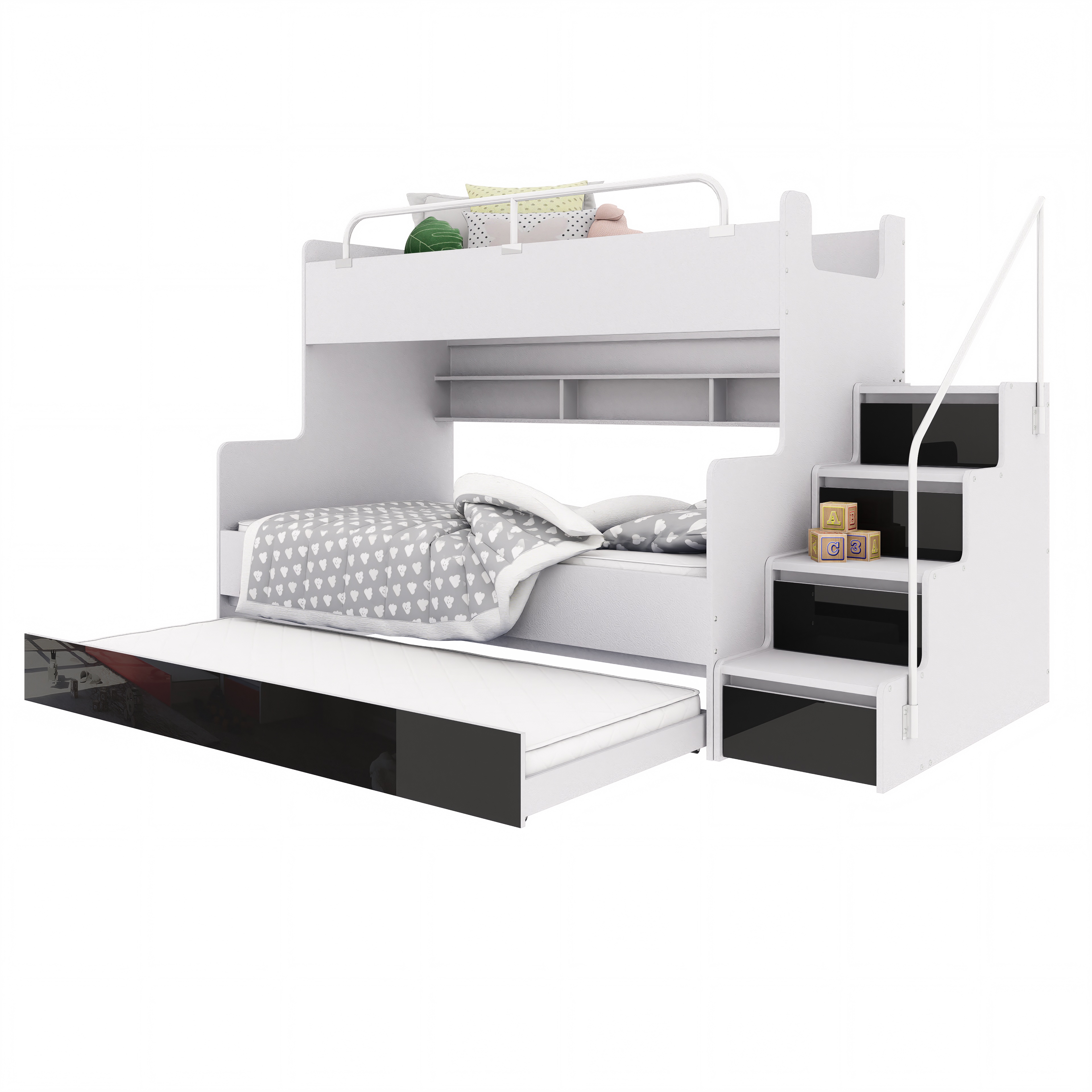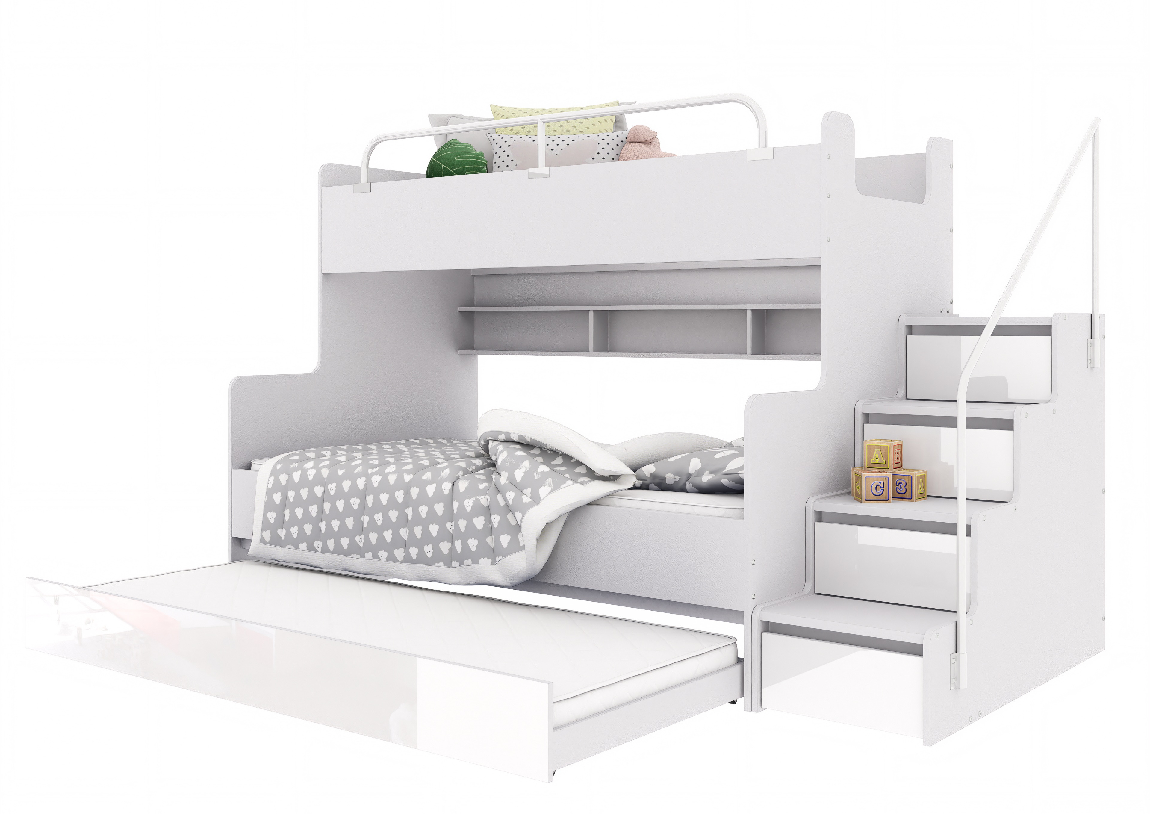 Łóżko piętrowe KIKI3 z dodatkowym spaniem to wszechstronny i funkcjonalny mebel, który doskonale odpowiada na potrzeby nowoczesnej dziecięcej lub młodzieżowej sypialni. Zaprojektowane z myślą o codziennym komforcie i estetyce, łączy wygodne miejsca do spania z praktycznymi rozwiązaniami do przechowywania. Solidna konstrukcja zapewnia bezpieczeństwo, a możliwość wyboru strony schodków ułatwia dopasowanie łóżka do każdego wnętrza. Wbudowane półki przy dolnym łóżku oferują miejsce na książki, zabawki i inne drobiazgi, które warto mieć pod ręką.