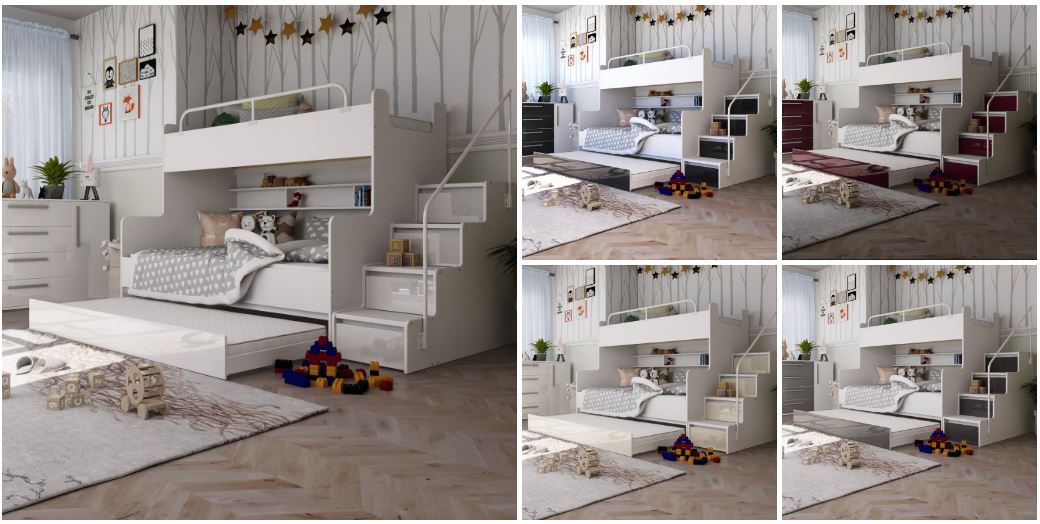 - Schodki z boku łóżka pełnią funkcję pojemników, które wysuwa się na prowadnicach rolkowych,