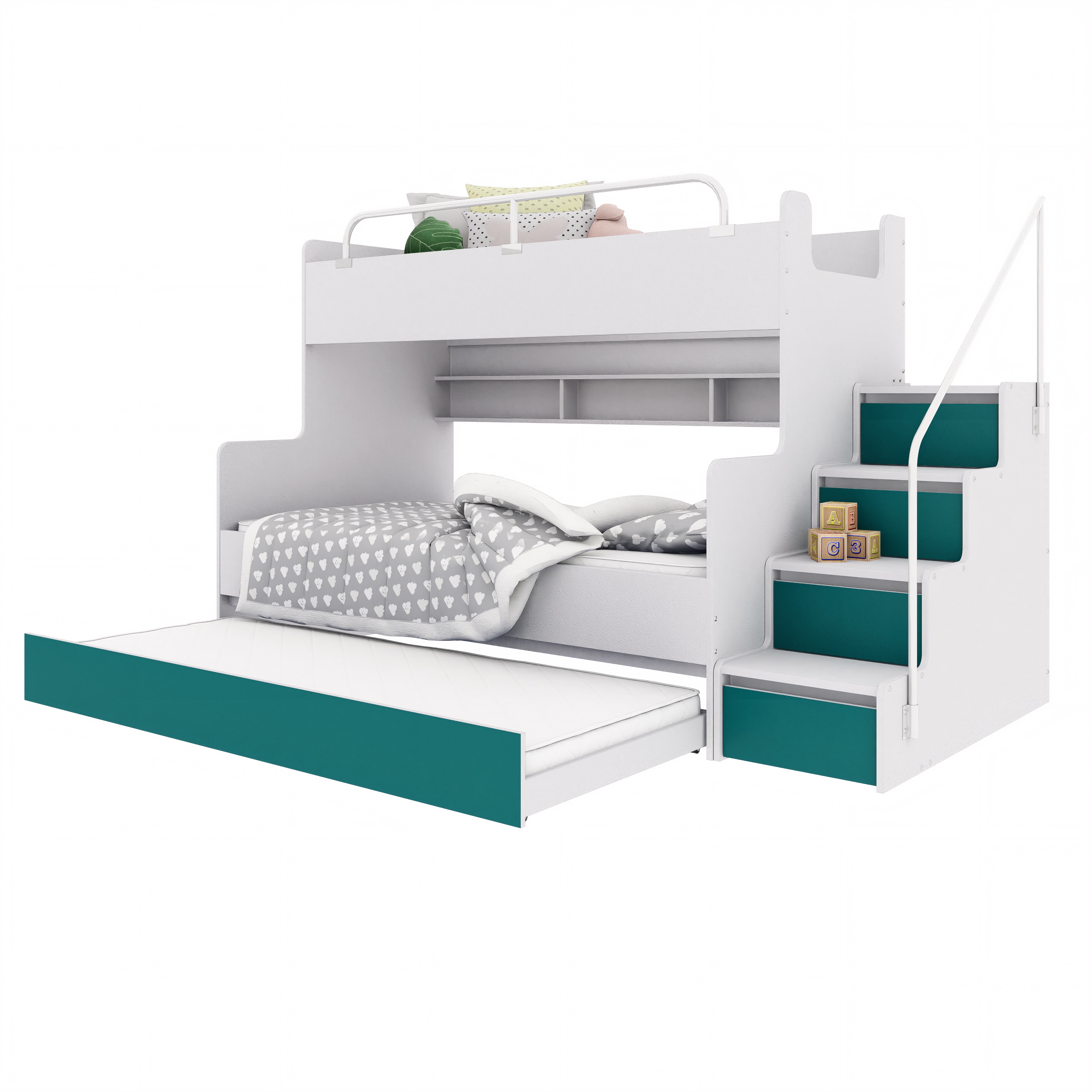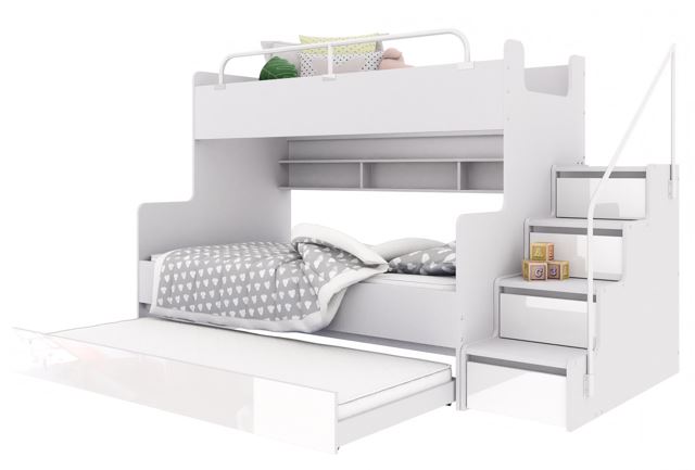 Łóżko piętrowe KIKI3 z dodatkowym spaniem to wszechstronny i funkcjonalny mebel, który doskonale odpowiada na potrzeby nowoczesnej dziecięcej lub młodzieżowej sypialni. Zaprojektowane z myślą o codziennym komforcie i estetyce, łączy wygodne miejsca do spania z praktycznymi rozwiązaniami do przechowywania. Solidna konstrukcja zapewnia bezpieczeństwo, a możliwość wyboru strony schodków ułatwia dopasowanie łóżka do każdego wnętrza. Wbudowane półki przy dolnym łóżku oferują miejsce na książki, zabawki i inne drobiazgi, które warto mieć pod ręką.