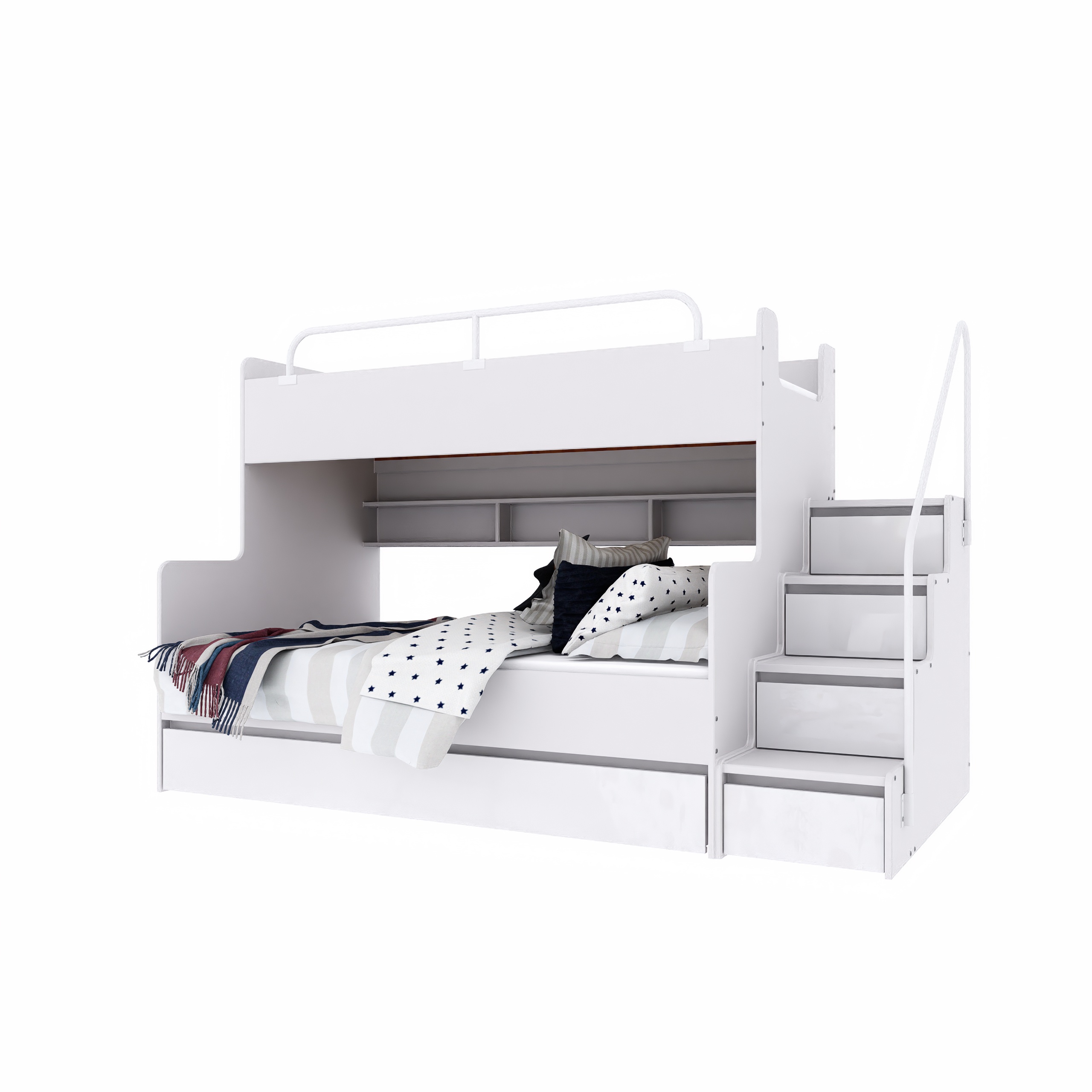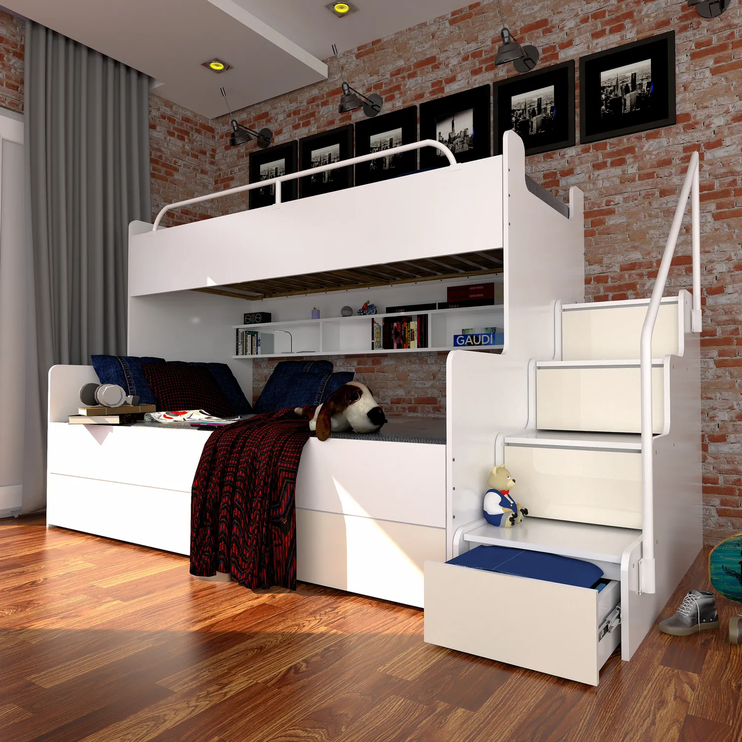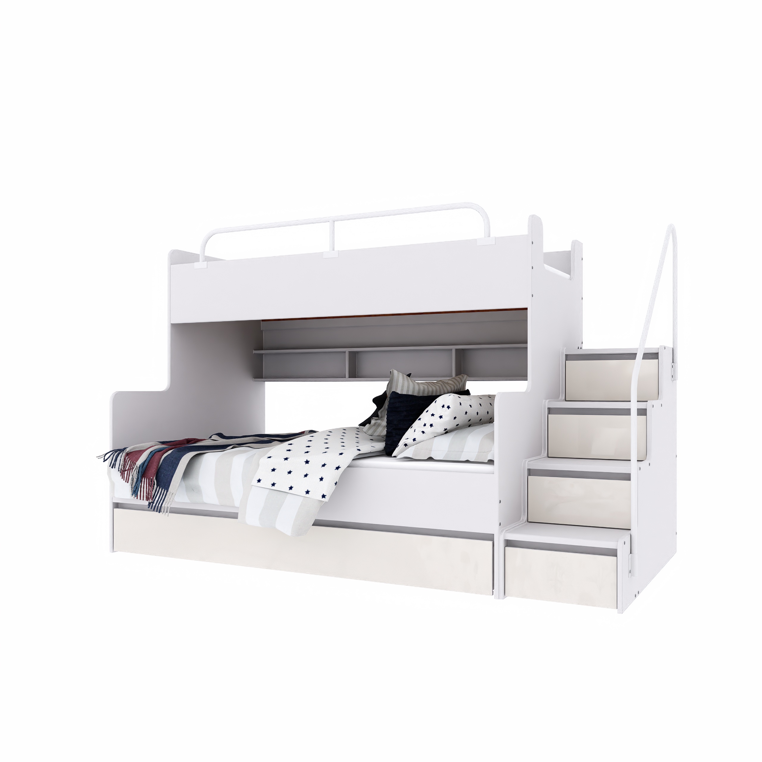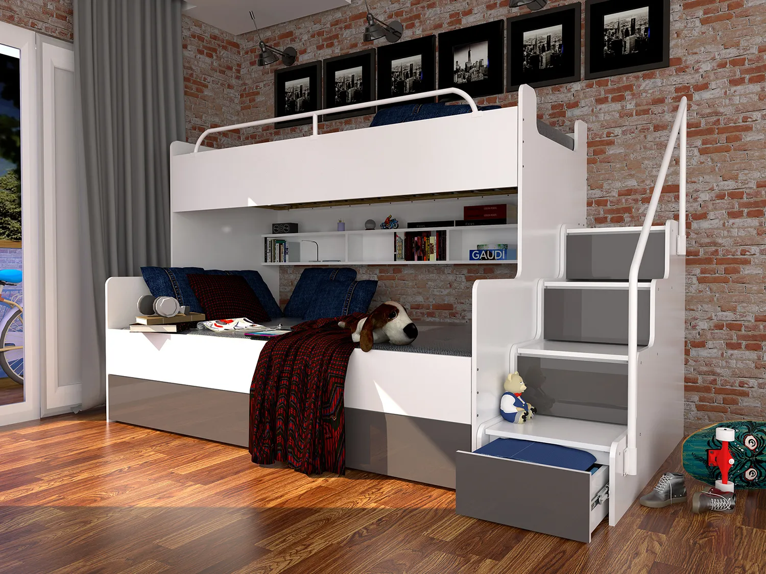 Łóżko piętrowe KIKI3 ze schodkami 2/3 osobowe - ecru połysk