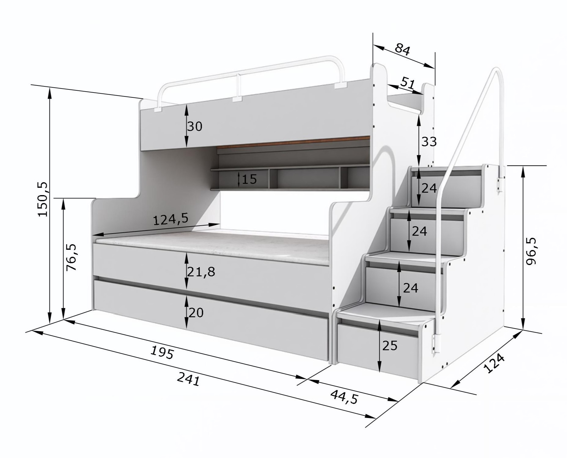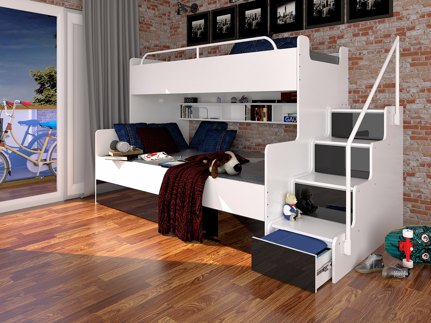 - Schodki z boku łóżka pełnią funkcję pojemników, które wysuwa się na prowadnicach rolkowych,