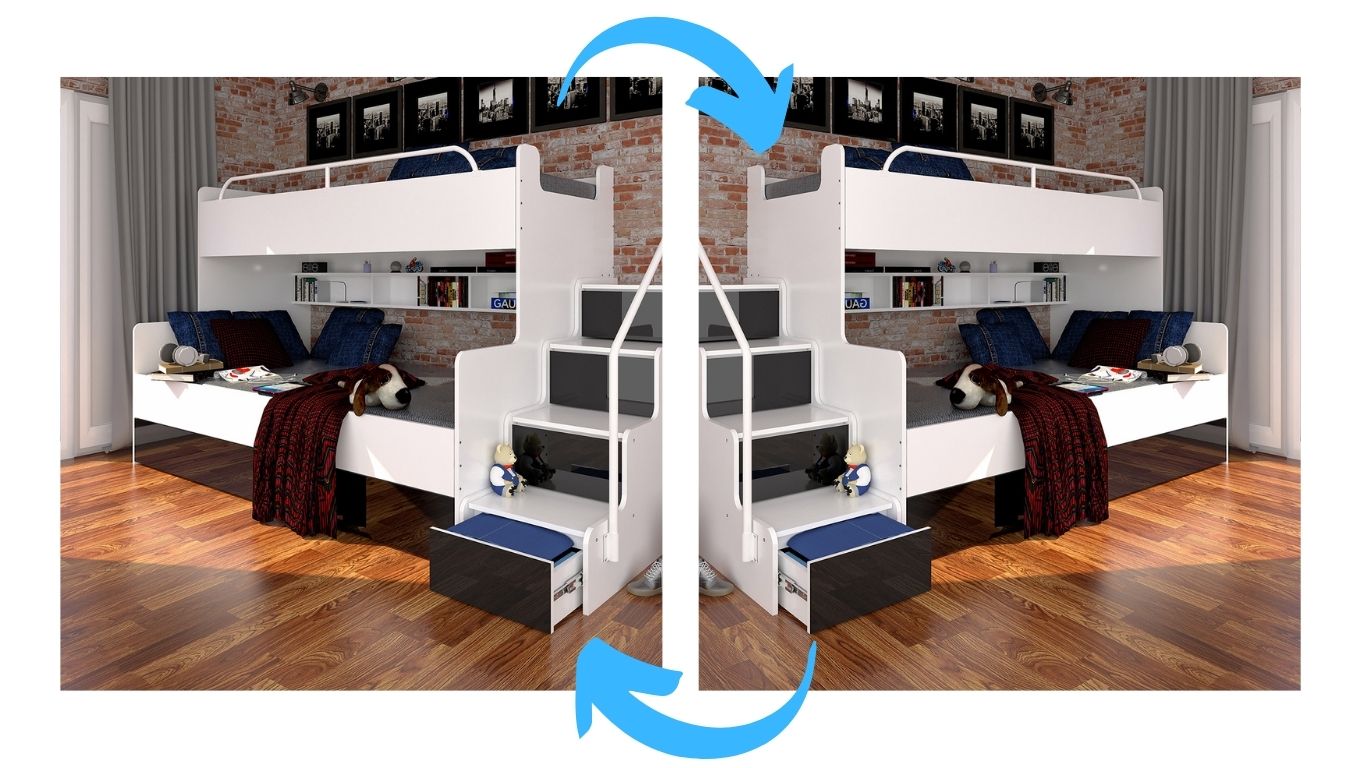 Schodki mogą być ustawione równolegle lub prostopadle do korpusu łóżka (podczas montażu to klient decyduje o ustawieniu schodków)