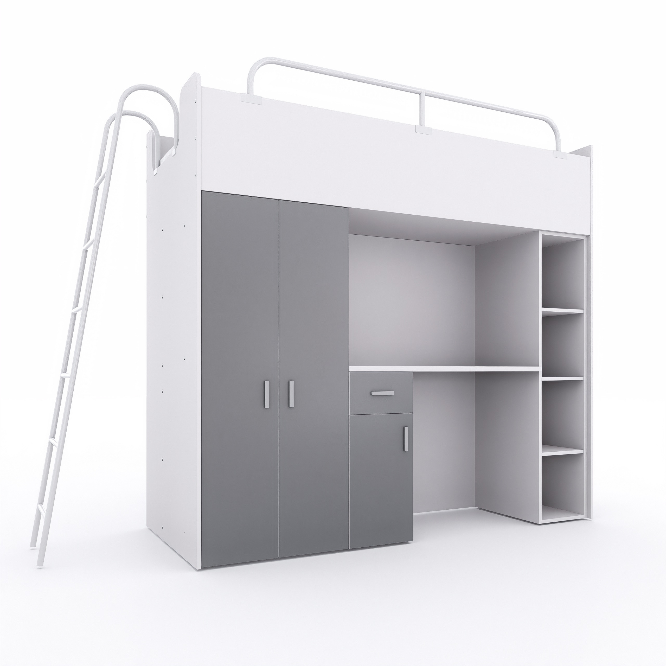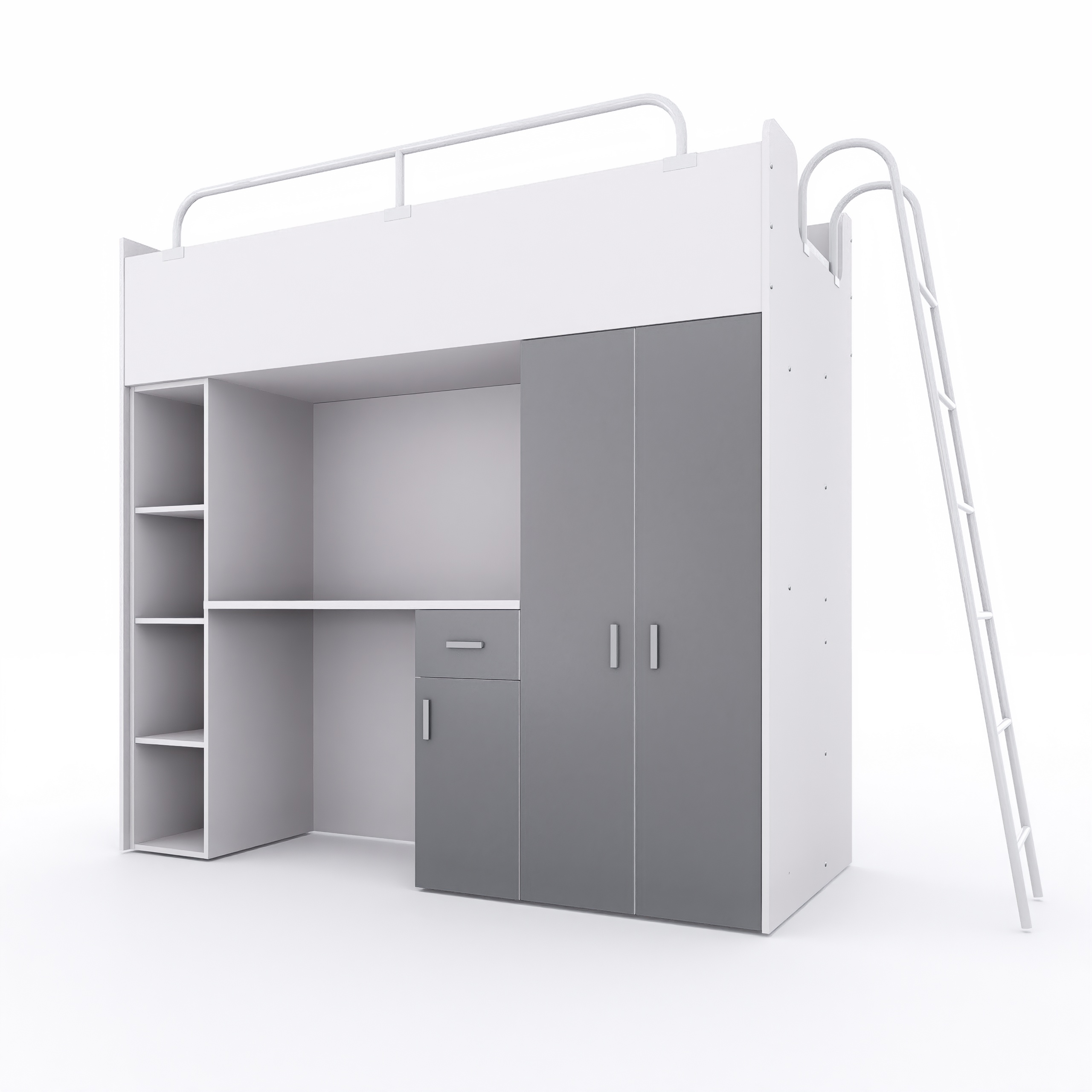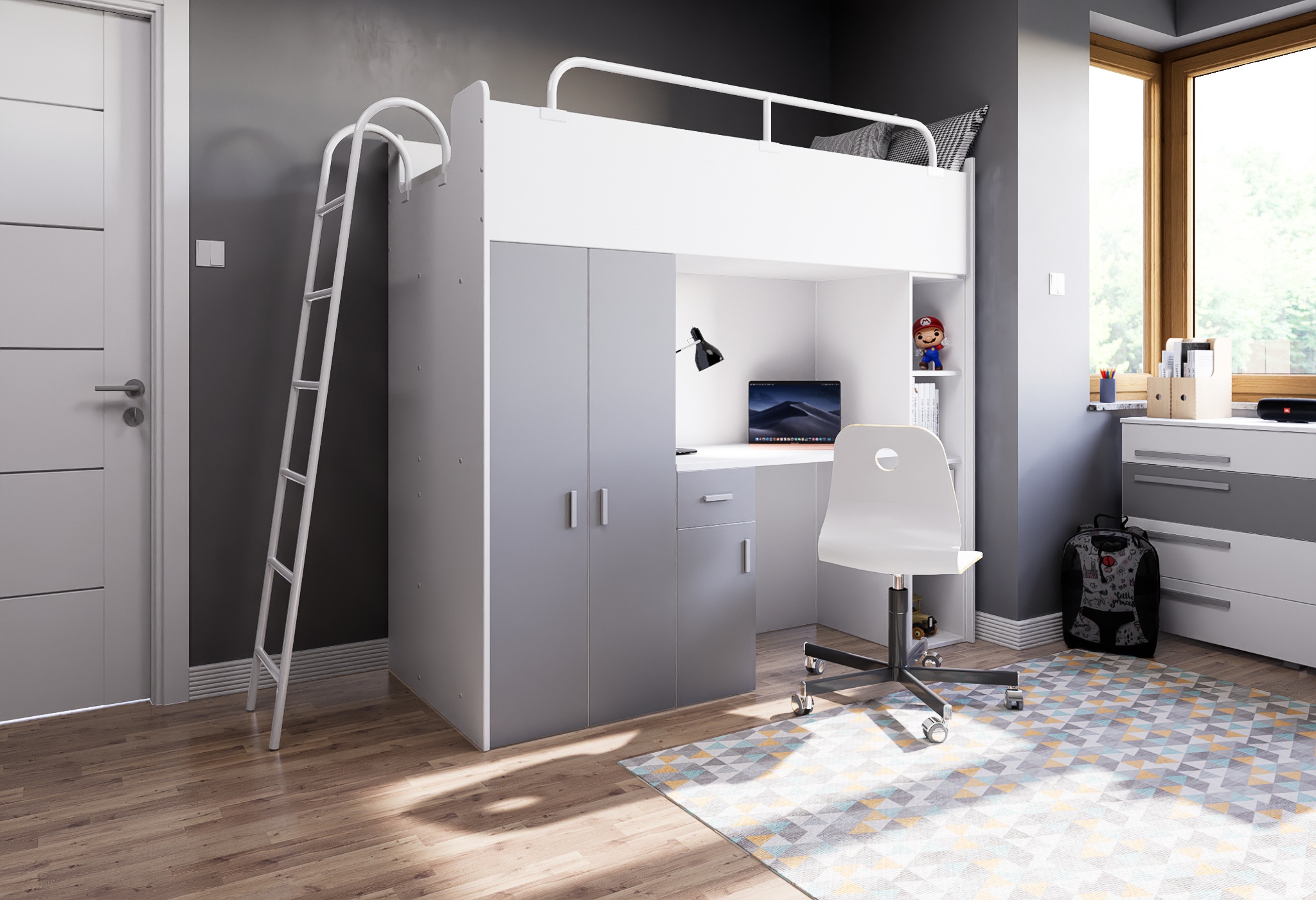 Łóżko piętrowe KIKI z biurkiem i drabinką to idealne rozwiązanie dla dzieci i młodzieży, które łączy w sobie funkcjonalność, wygodę i oszczędność miejsca. To wielozadaniowe mebel, który pozwala na optymalne wykorzystanie przestrzeni w pokoju. Na górnym poziomie znajduje się wygodne łóżko, zapewniające wyjątkowe miejsce do snu. Konstrukcja jest solidna i bezpieczna, z barierkami zabezpieczającymi przed przypadkowym wypadnięciem. Poniżej łóżka znajduje się przestronne biurko, idealne do nauki, pracy lub twórczych zajęć. Biurko jest wyposażone w praktyczne półki i schowki, aby utrzymać porządek i przechowywać niezbędne przedmioty. Drabinka zamontowana po boku łóżka umożliwia bezpieczne wchodzenie i schodzenie z górnego poziomu. Została zaprojektowana tak, aby być stabilna i wygodna w użyciu, a jednocześnie nie zajmować zbyt wiele miejsca.