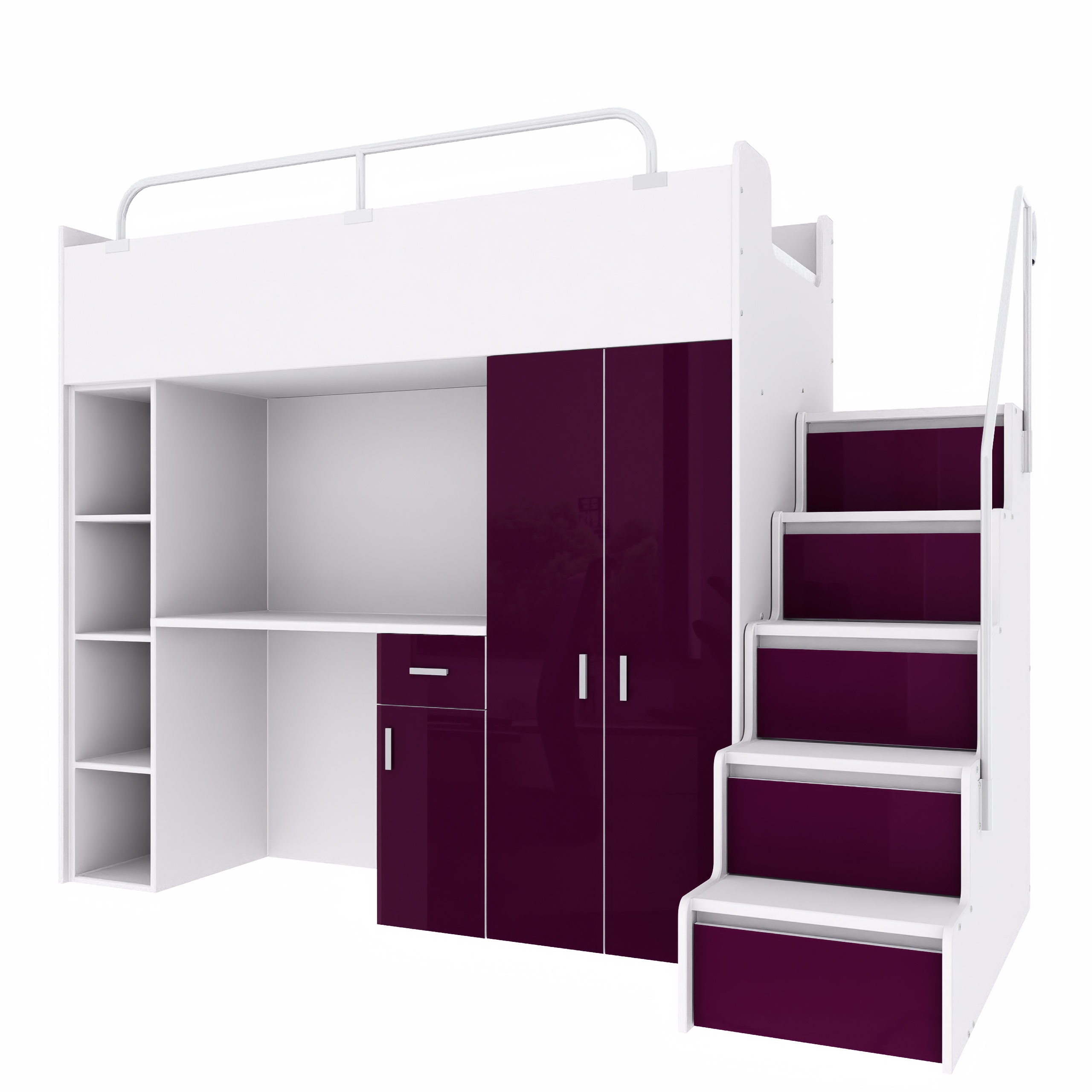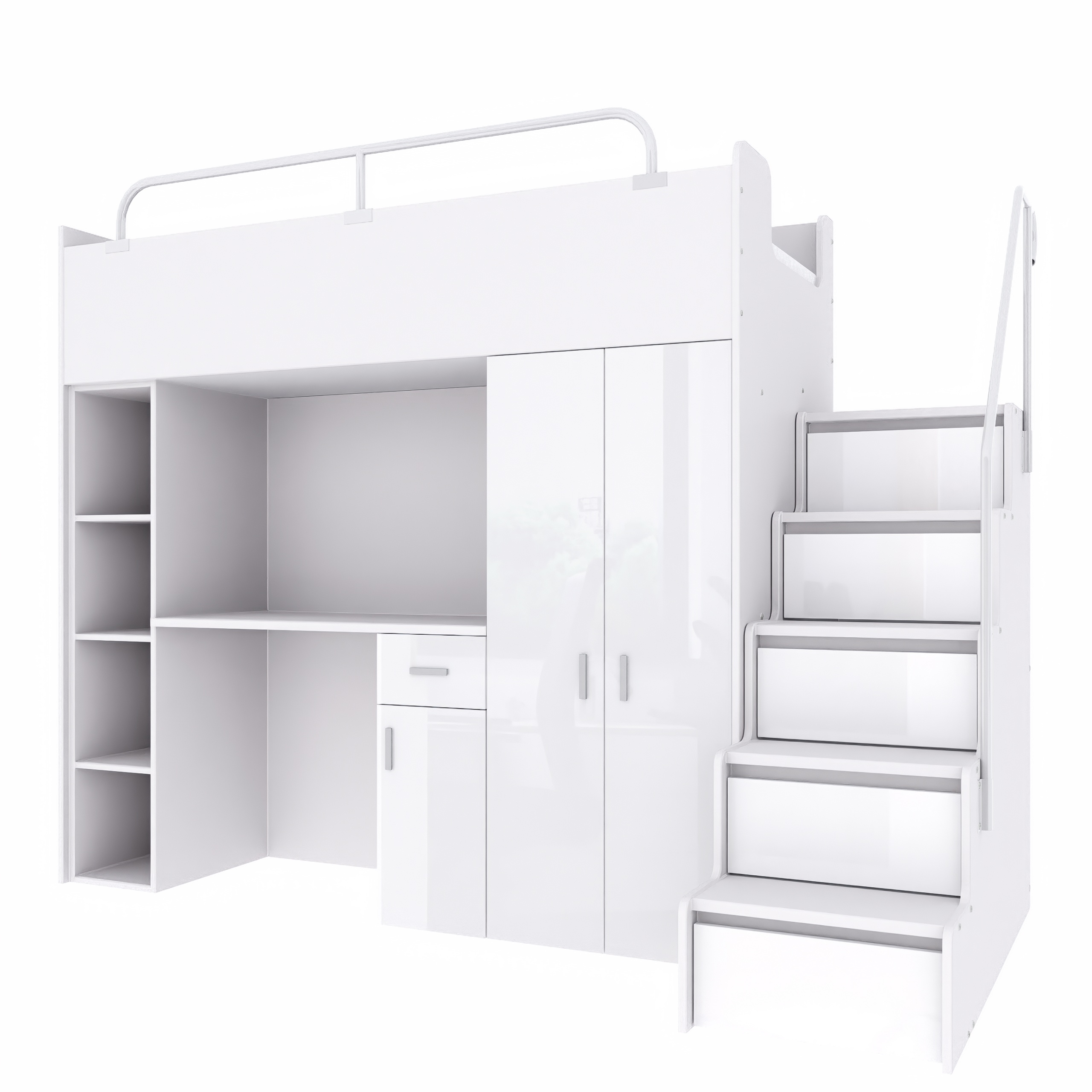 Łóżko piętrowe KIKI z biurkiem i schodkami to idealne rozwiązanie dla dzieci i młodzieży, które łączy w sobie funkcjonalność, wygodę i oszczędność miejsca. To wielozadaniowe mebel, który pozwala na optymalne wykorzystanie przestrzeni w pokoju. Na górnym poziomie znajduje się wygodne łóżko, zapewniające wyjątkowe miejsce do snu. Konstrukcja jest solidna i bezpieczna, z barierkami zabezpieczającymi przed przypadkowym wypadnięciem. Poniżej łóżka znajduje się przestronne biurko, idealne do nauki, pracy lub twórczych zajęć. Biurko jest wyposażone w praktyczne półki i schowki, aby utrzymać porządek i przechowywać niezbędne przedmioty. Schodki zamontowane po boku łóżka umożliwiają bezpieczne wchodzenie i schodzenie z górnego poziomu. Schodki zostały zaprojektowane tak, aby były stabilne i wygodne w użyciu, a jednocześnie nie zajmowały zbyt wiele miejsca.