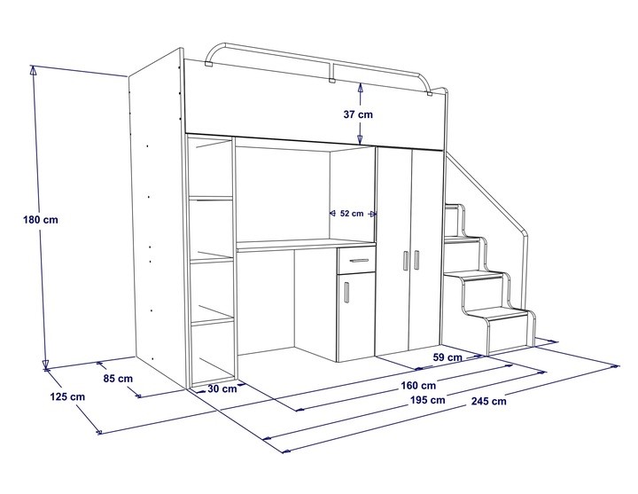 - W przypadku równoległego ułożenia w stosunku do korpusu łóżka: głębokość schodków 125 cm ,szerokość 45 cm, wysokość 125 cm