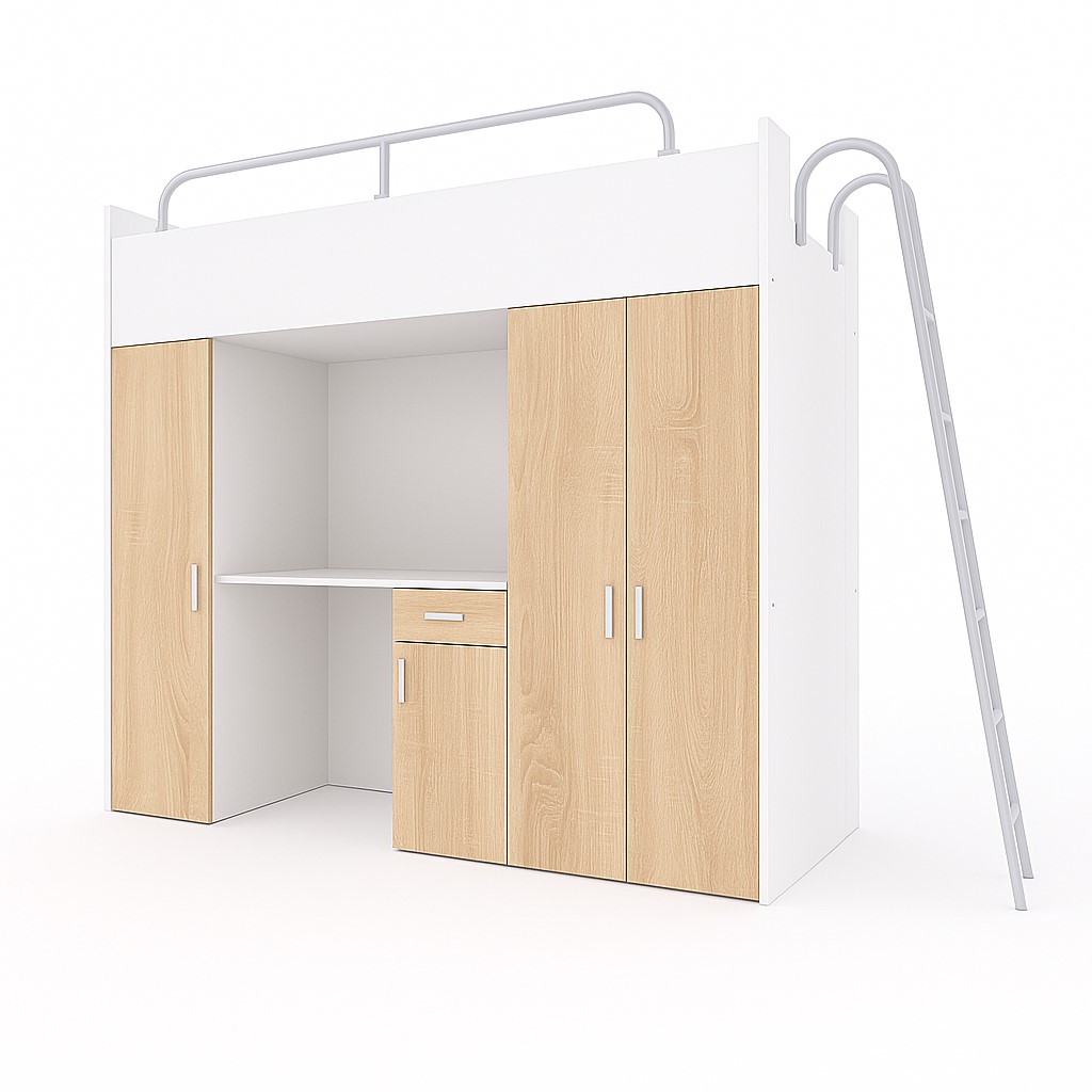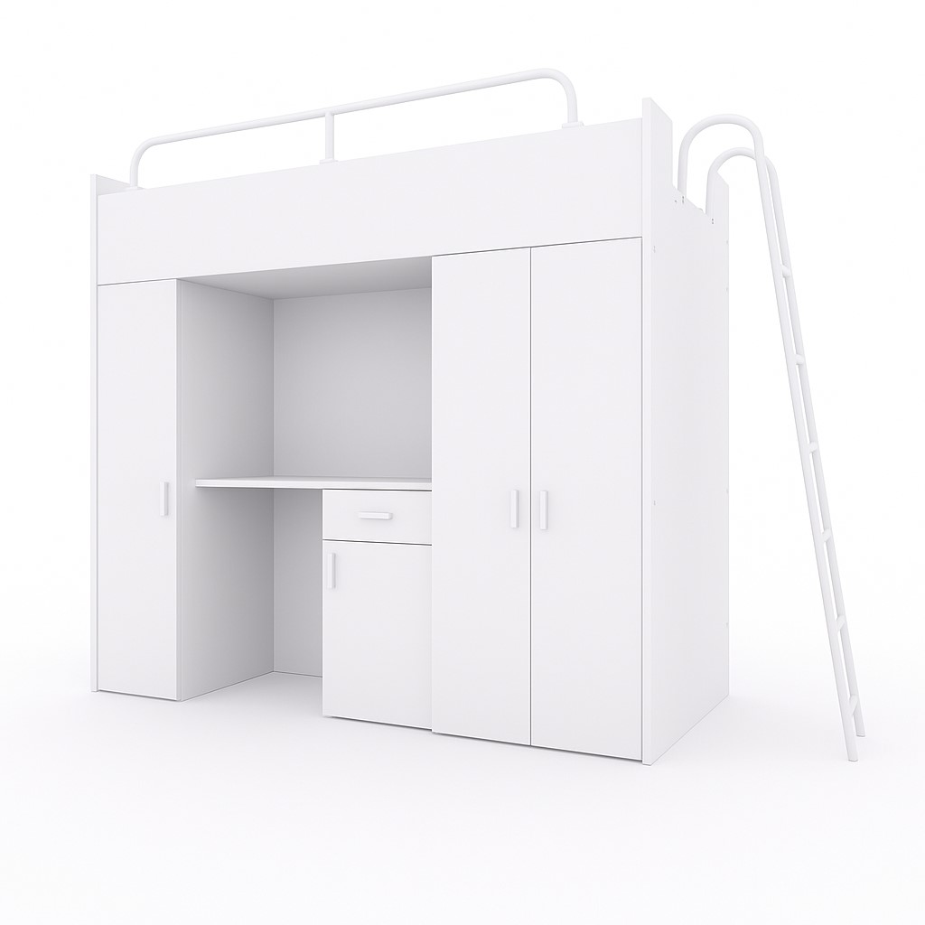 Łóżko piętrowe KIKI5 (90x200 cm) z biurkiem i drabinką - biały MAT