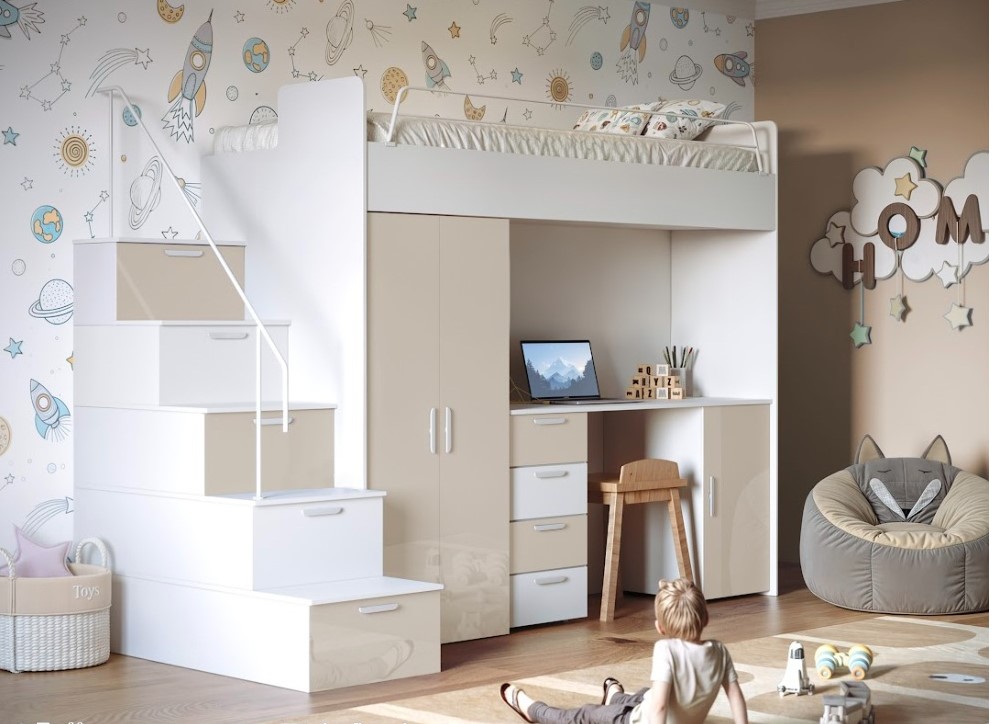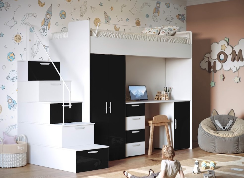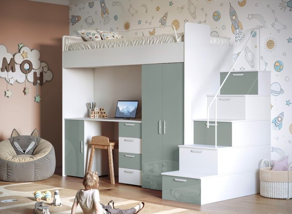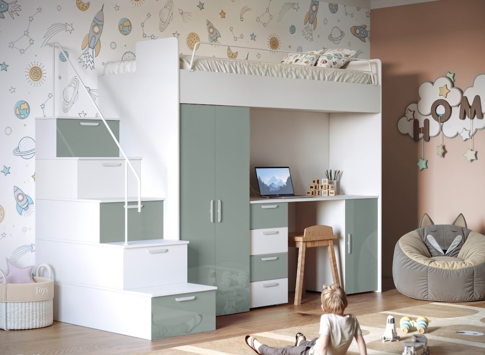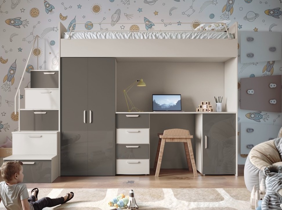 Nowoczesne łóżko piętrowe RAJ 4S to funkcjonalny zestaw mebli, który łączy miejsce do spania, nauki i przechowywania w jednym kompaktowym rozwiązaniu. Idealne do pokoju dziecka lub nastolatka — szczególnie tam, gdzie liczy się maksymalne wykorzystanie przestrzeni.