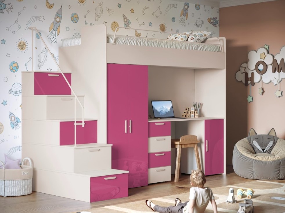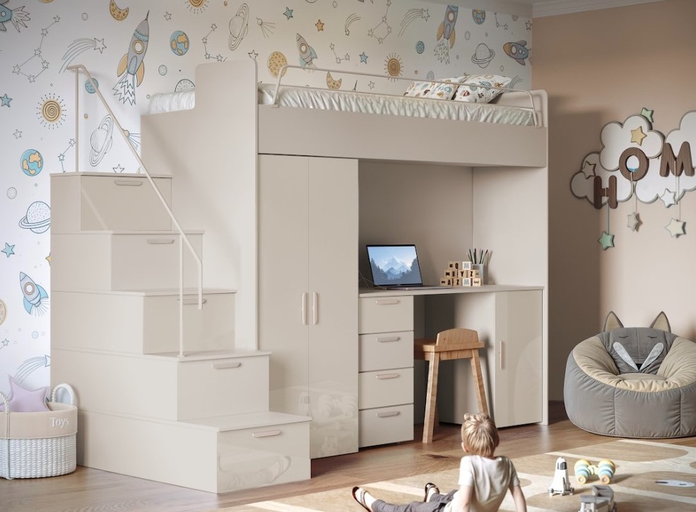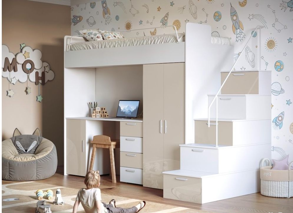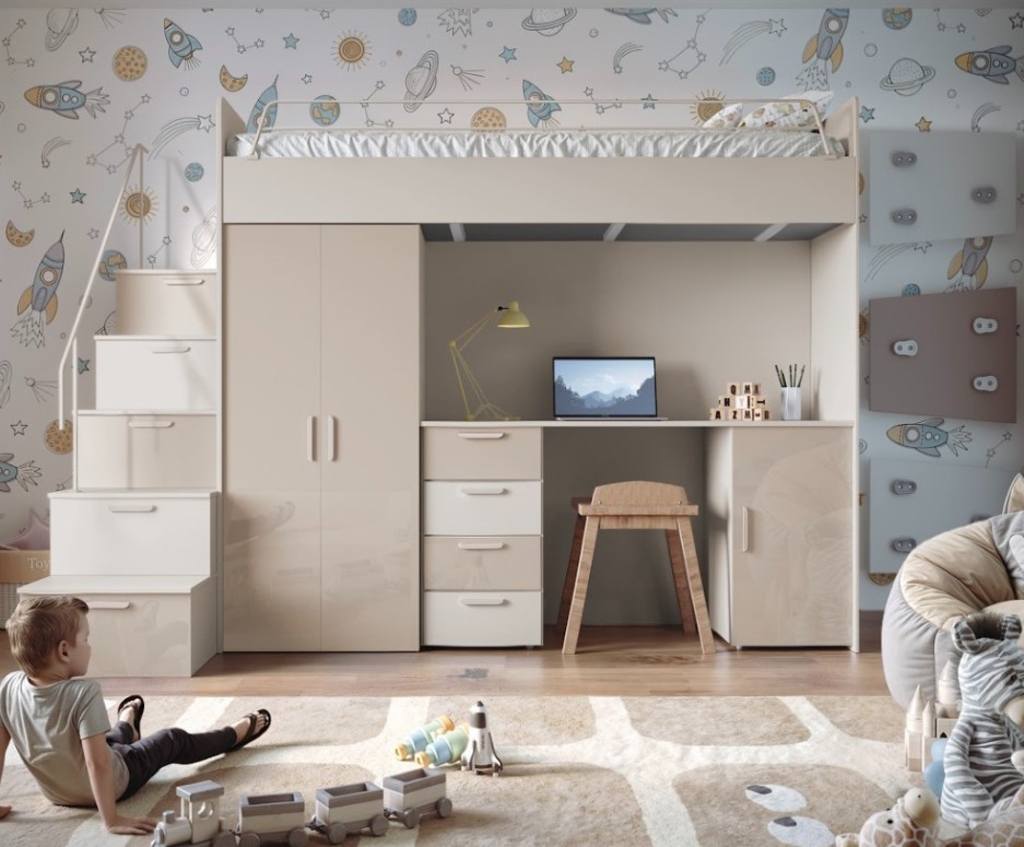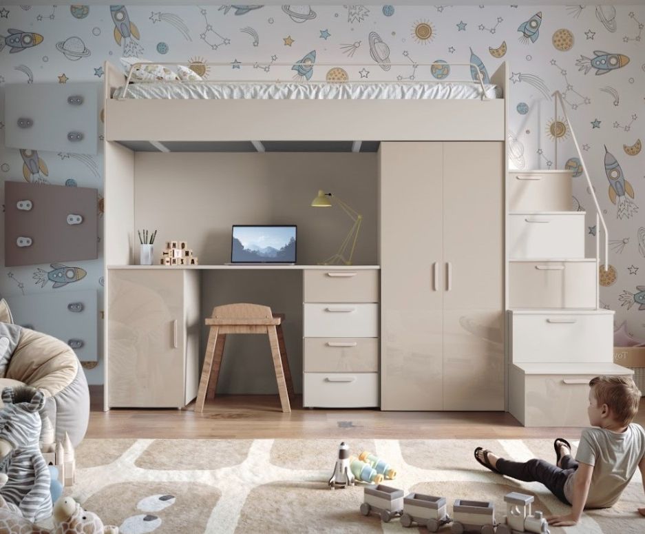 Nowoczesne łóżko piętrowe RAJ 4S to funkcjonalny zestaw mebli, który łączy miejsce do spania, nauki i przechowywania w jednym kompaktowym rozwiązaniu. Idealne do pokoju dziecka lub nastolatka — szczególnie tam, gdzie liczy się maksymalne wykorzystanie przestrzeni.