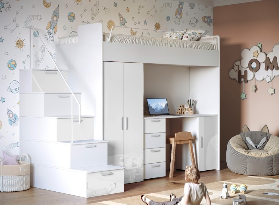 Łóżko piętrowe młodzieżowe 80x200 z biurkiem i szafą – RAJ 4S biały + połysk