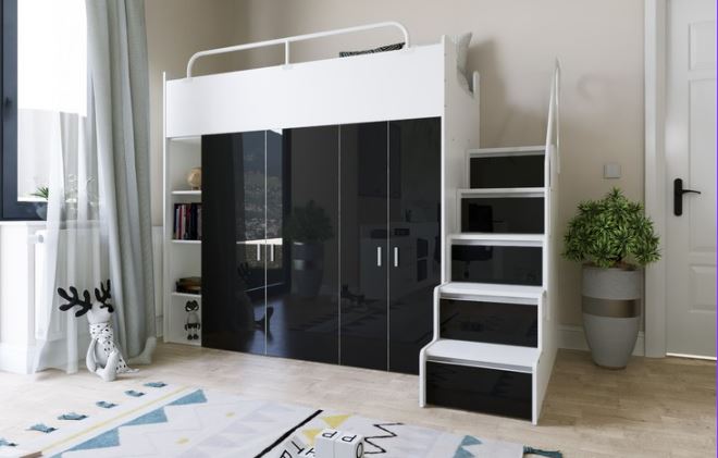 Łóżko piętrowe ze schodkami i szafami KIKI 2 MAX - 90x200 cm czarny połysk