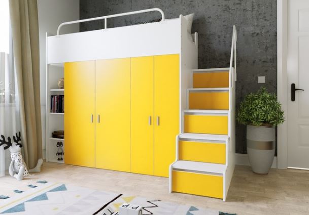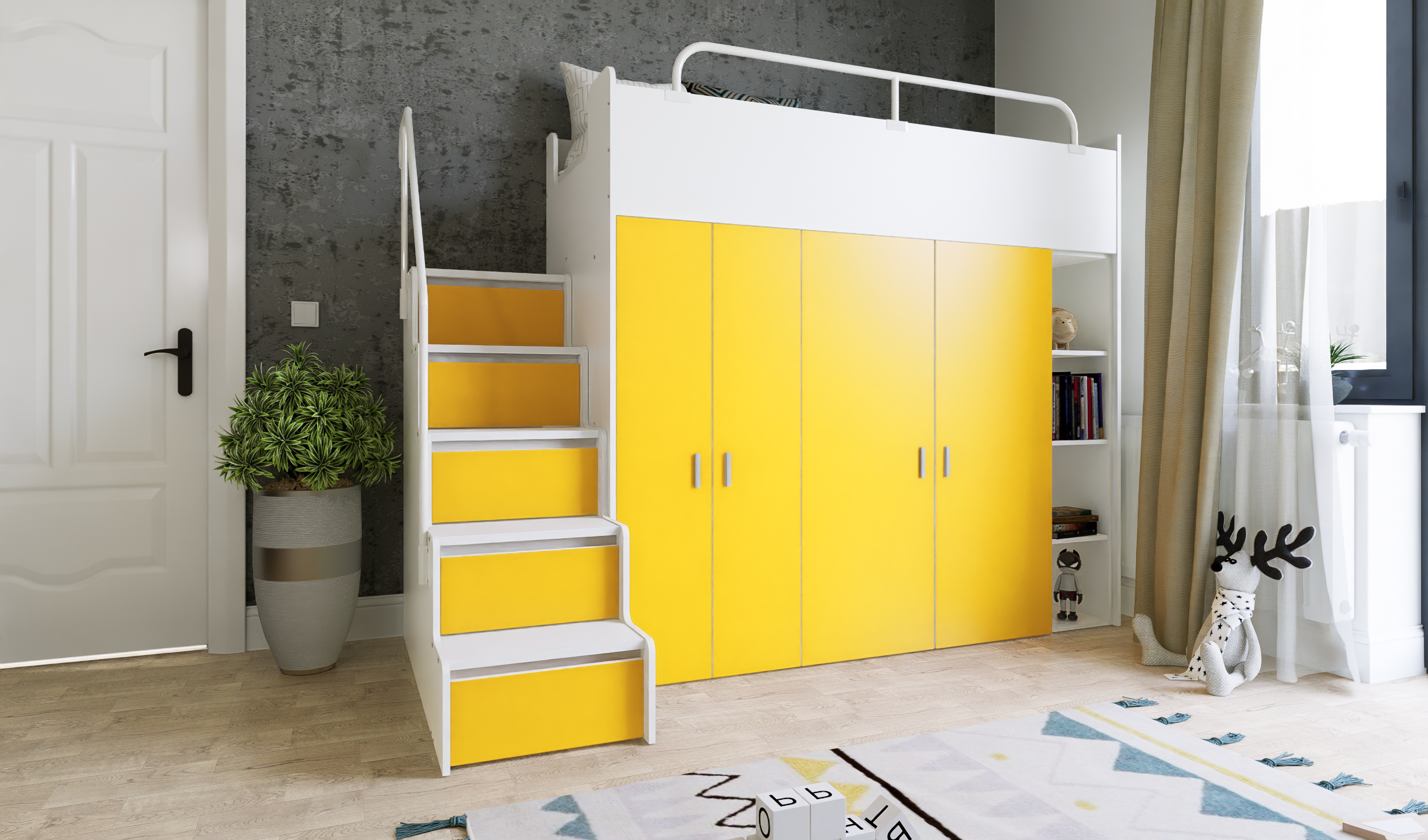 Łóżko piętrowe ze schodkami i szafami KIKI 2 MAX - 90x200 cm żółty mat