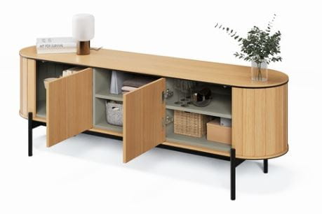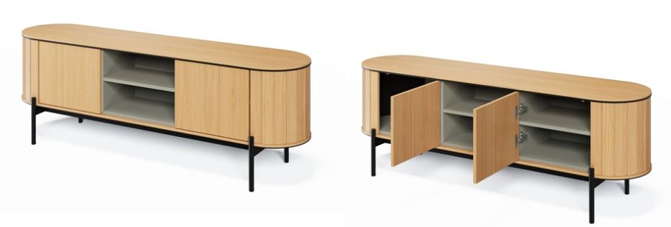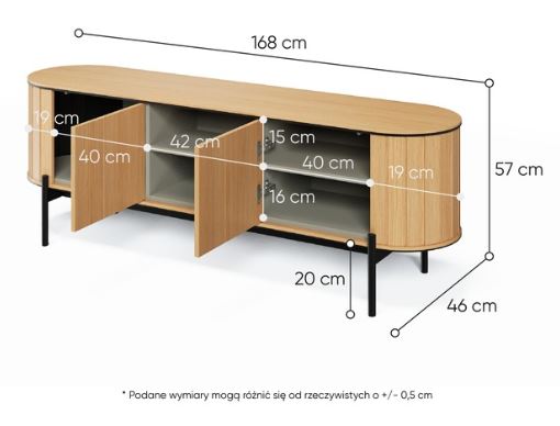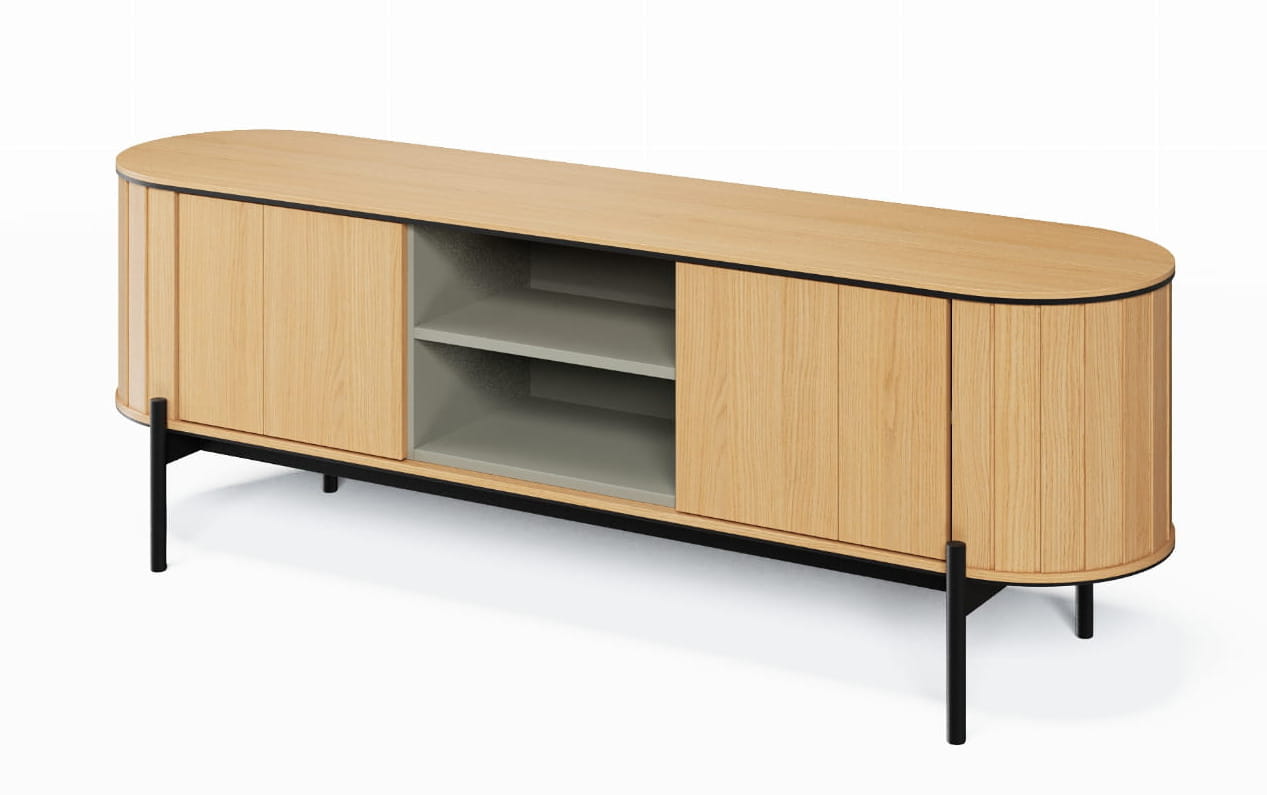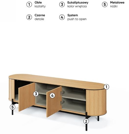 Szafka RTV ROTTO RT-05 o szerokości 167 cm to elegancka i funkcjonalna propozycja do nowoczesnego salonu. Doskonale sprawdza się jako miejsce do przechowywania sprzętu telewizyjnego oraz akcesoriów multimedialnych. Dzięki trzem przestronnym półkom w modnym odcieniu eukaliptusowym, szafka oferuje wystarczającą przestrzeń na telewizor, dekoder, konsolę do gier czy kolekcję filmów. Innowacyjny system push to open umożliwia wygodne otwieranie szafki jednym, delikatnym naciśnięciem, co zapewnia komfort użytkowania. Całość stoi na smukłych, czarnych metalowych nóżkach, które dodają meblowi nowoczesnego charakteru. Subtelnie zaokrąglone krawędzie szafki sprawiają, że prezentuje się ona elegancko, a zarazem przytulnie, idealnie wpisując się w trendy nowoczesnych wnętrz. Szafka RTV ROTTO RT-05 to doskonały wybór, łączący funkcjonalność z designem, który zachwyca i wzbogaca każde pomieszczenie.