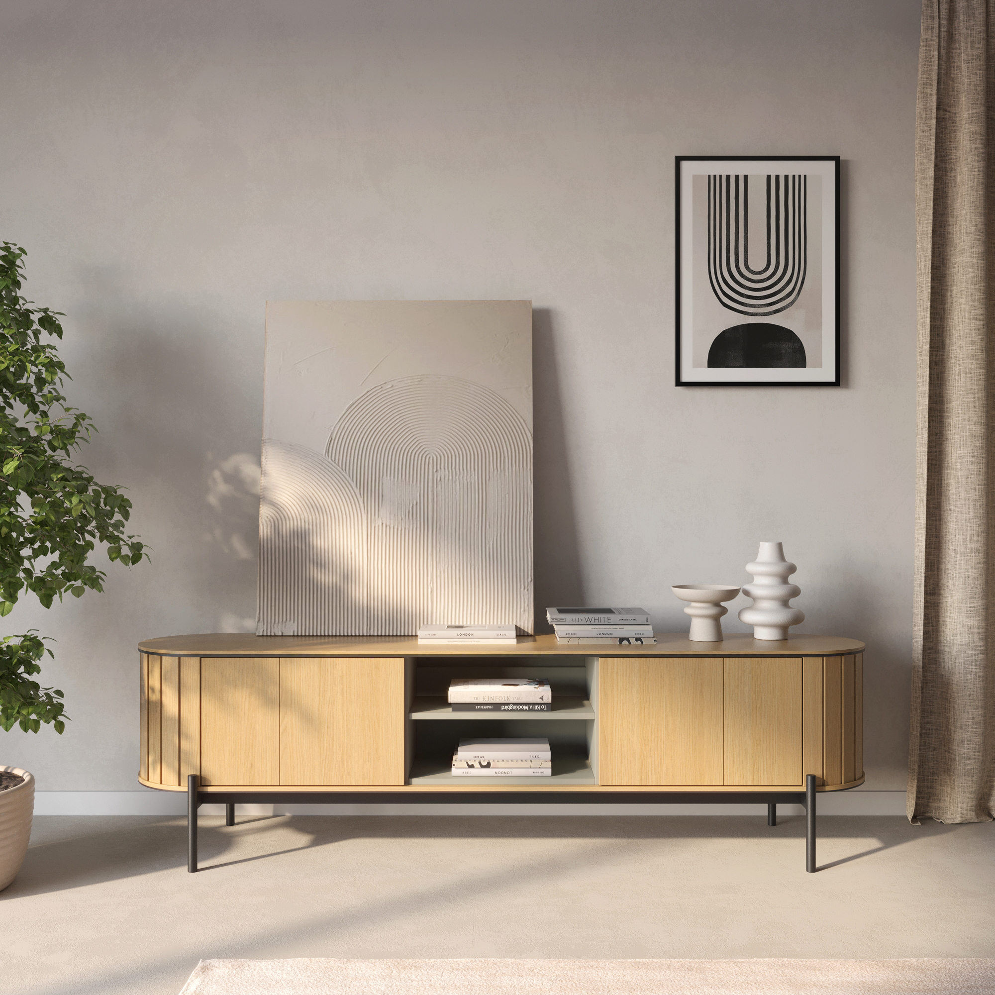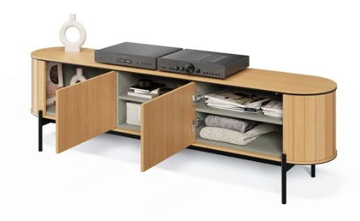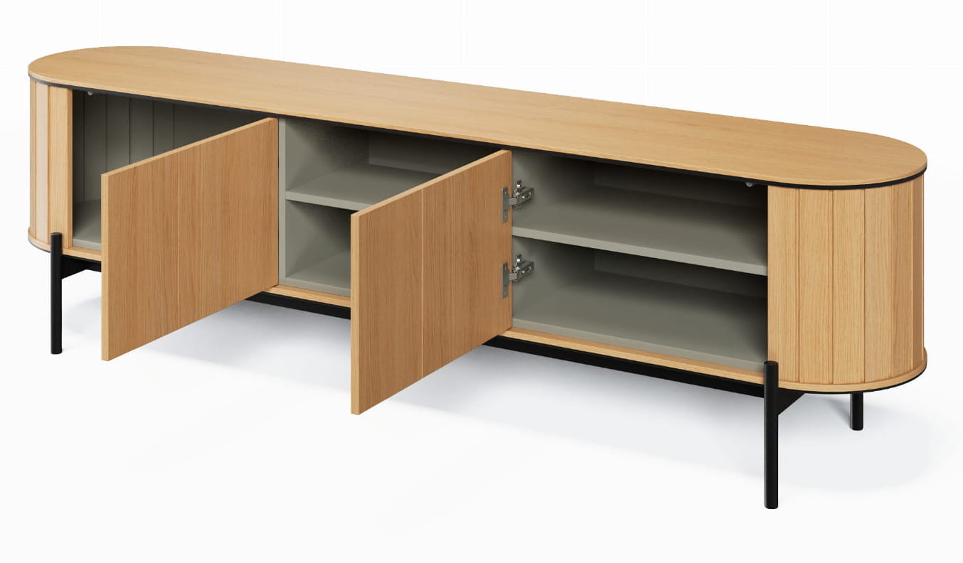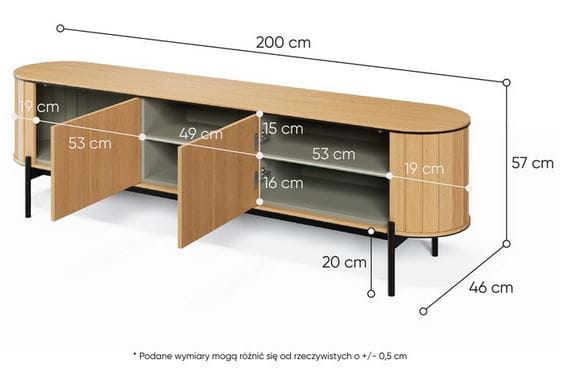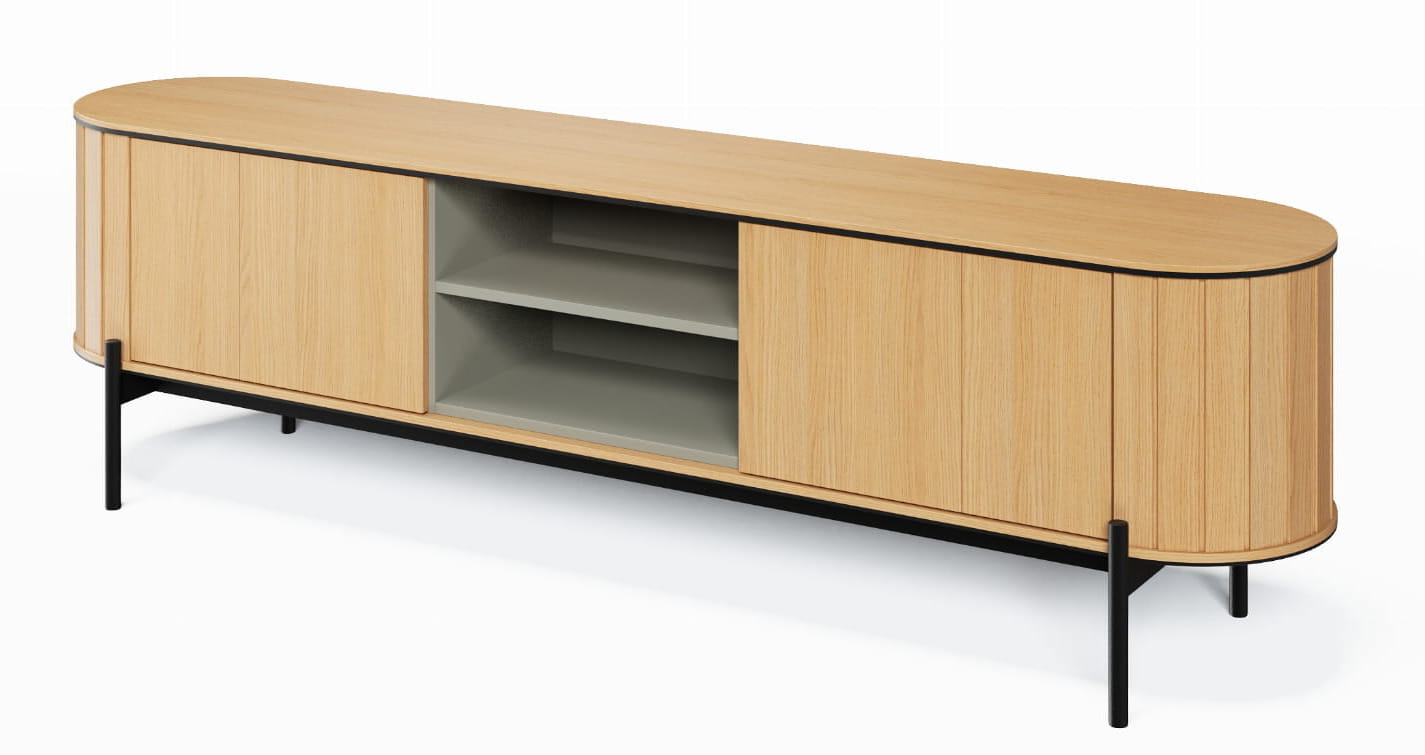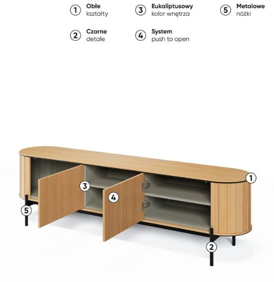 Szafka RTV ROTTO RT-06 o szerokości 200 cm to elegancka i funkcjonalna propozycja do nowoczesnego salonu. Doskonale sprawdza się jako miejsce do przechowywania sprzętu telewizyjnego oraz akcesoriów multimedialnych. Dzięki trzem przestronnym półkom w modnym odcieniu eukaliptusowym, szafka oferuje wystarczającą przestrzeń na telewizor, dekoder, konsolę do gier czy kolekcję filmów. Innowacyjny system push to open umożliwia wygodne otwieranie szafki jednym, delikatnym naciśnięciem, co zapewnia komfort użytkowania. Całość stoi na smukłych, czarnych metalowych nóżkach, które dodają meblowi nowoczesnego charakteru. Subtelnie zaokrąglone krawędzie szafki sprawiają, że prezentuje się ona elegancko, a zarazem przytulnie, idealnie wpisując się w trendy nowoczesnych wnętrz. Szafka RTV ROTTO RT-06 to doskonały wybór, łączący funkcjonalność z designem, który zachwyca i wzbogaca każde pomieszczenie.