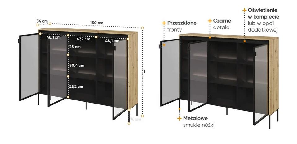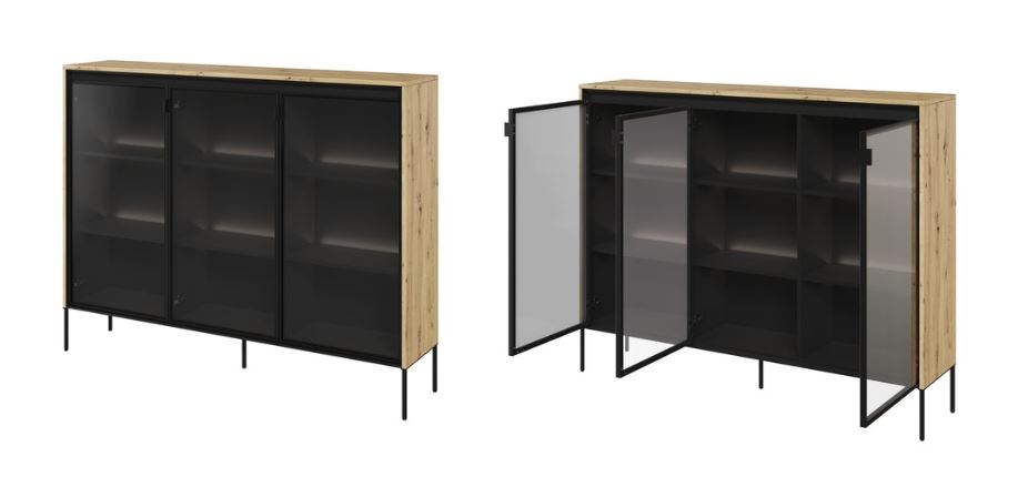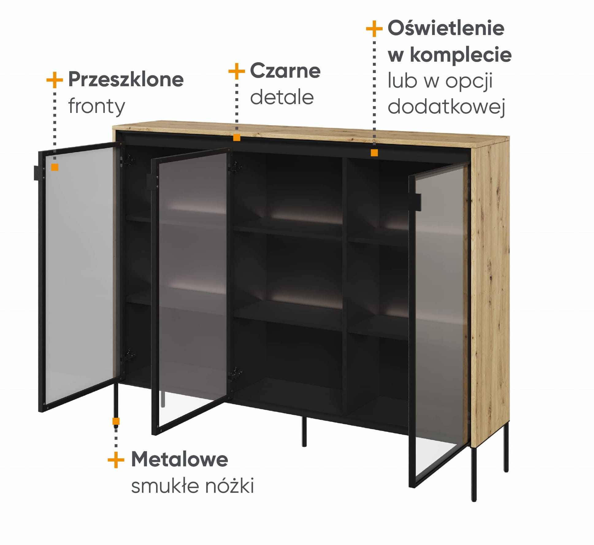 Niska witryna TREND TR-08 to doskonały wybór dla osób szukających eleganckiego sposobu na wyeksponowanie dekoracji. Wyposażona w przeszklone drzwiczki i przestronne półki z wytrzymałej płyty, witryna łączy nowoczesny design z funkcjonalnością. Smukłe nóżki nadają jej lekkości, a pasek LED pod górnym blatem subtelnie oświetla wnętrze. Dodatkowo, możliwość dokupienia oświetlenia LED na półki pozwala na urozmaicenie wyglądu mebla. Witryna doskonale sprawdzi się w salonie, jadalni czy przedpokoju, wprowadzając do wnętrza elegancję i nowoczesny charakter.