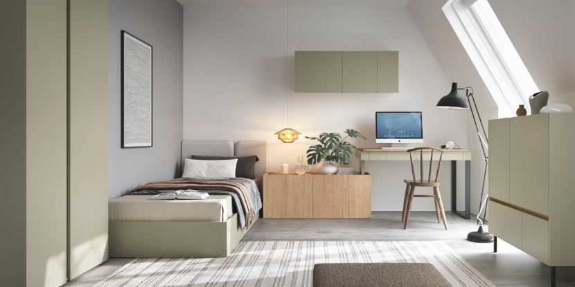 Połączenie subtelnych eukaliptusowych frontów z naturalnym, ciepłym dębem tworzy harmonijną i przytulną przestrzeń w pokoju.