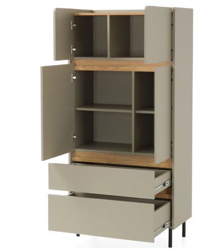 Matowe wykończenie frontów i korpusu nadaje meblowi stylu i harmonii, sprawiając, że doskonale wpisuje się w salon, jadalnię, sypialnię, a także nowoczesne biuro.
