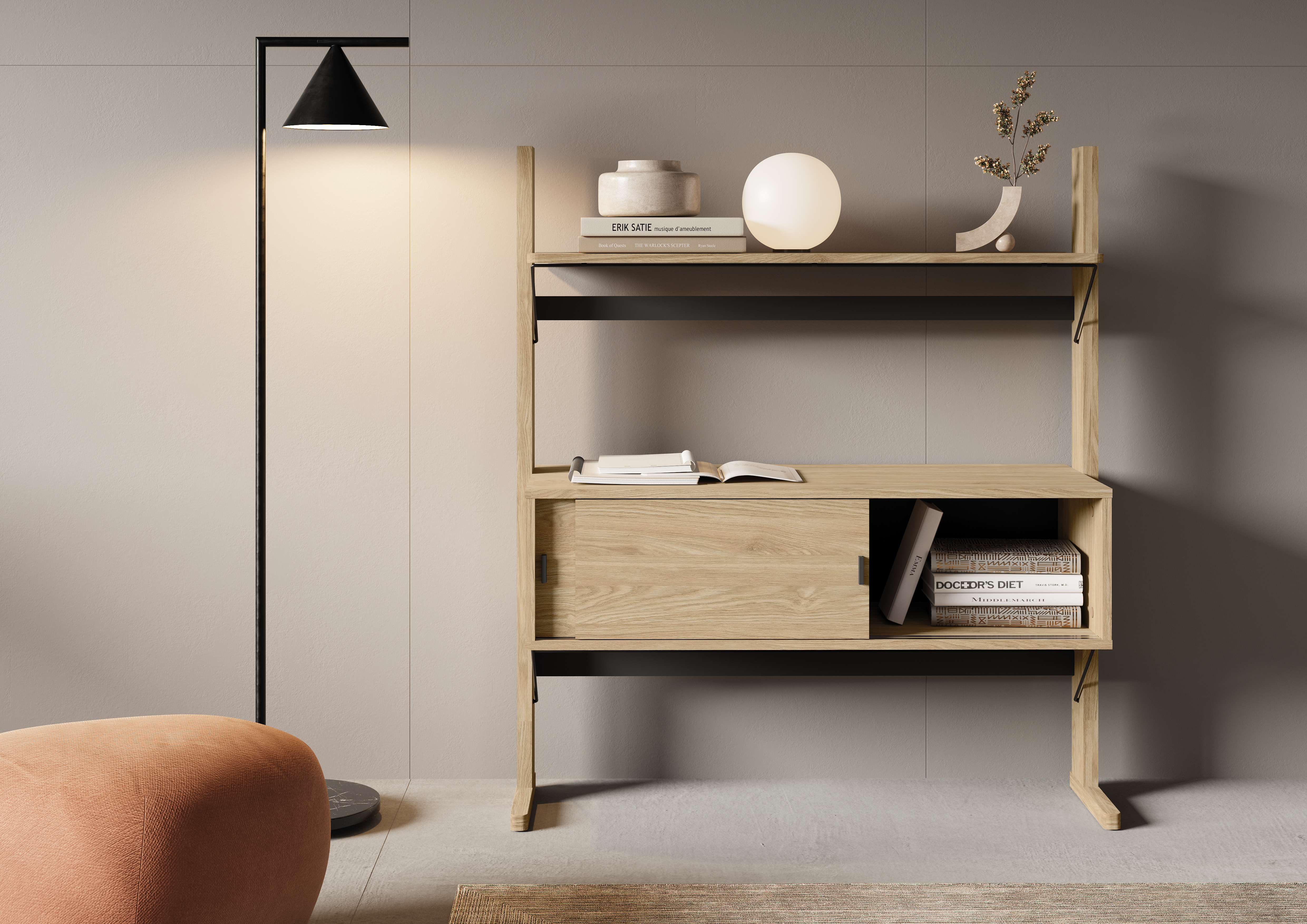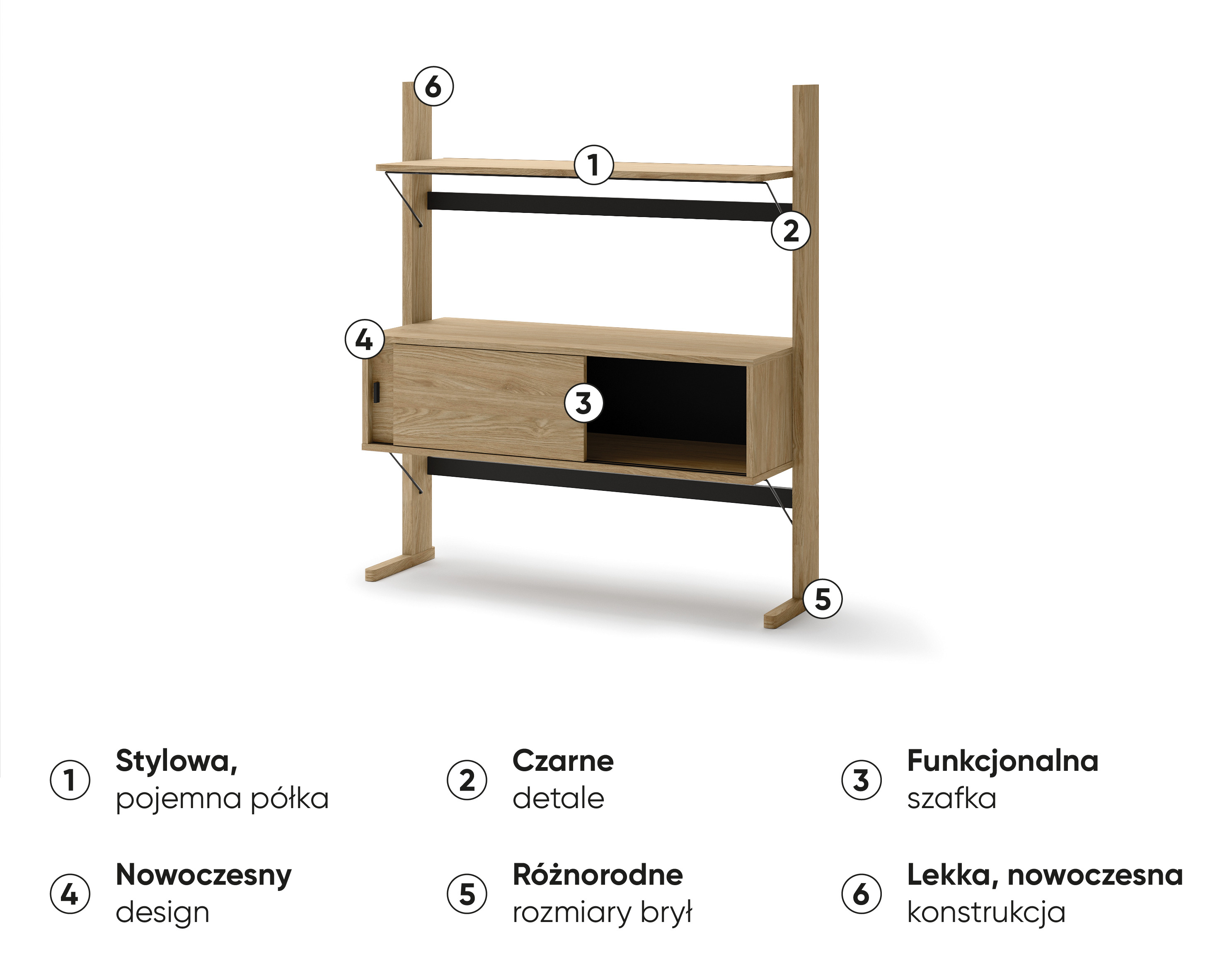 Regał OLLIE OL-03 to stylowe i funkcjonalne rozwiązanie do nowoczesnych wnętrz. Jego kompaktowa wysokość 121 cm sprawia, że nie przytłacza przestrzeni, a jednocześnie oferuje wystarczająco dużo miejsca do przechowywania. Wyposażony w praktyczną szafkę dwudrzwiową z przesuwnymi frontami, ułatwia utrzymanie porządku i wygodny dostęp do ukrytych przedmiotów. Nad szafką znajduje się otwarta półka – idealna na książki, dekoracje lub codzienne drobiazgi. Regał wykonano z trwałej płyty laminowanej w naturalnym, ciepłym odcieniu dębu, który nadaje wnętrzu przytulny, ale zarazem nowoczesny charakter. OLLIE OL-03 świetnie sprawdzi się w salonie, biurze czy sypialni – wszędzie tam, gdzie liczy się estetyka i praktyczność.