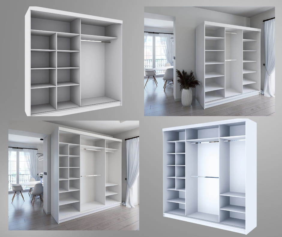 Poniżej prezentujemy przykładowe konfiguracje wnętrza otwartej szafy na wymiar, które mają charakter poglądowy i dobierane są indywidualnie, w zależności od wybranej szerokości oraz wysokości otwartej garderoby na zamówienie.
