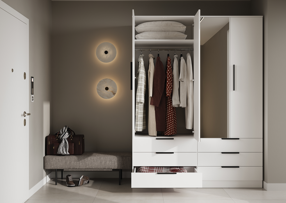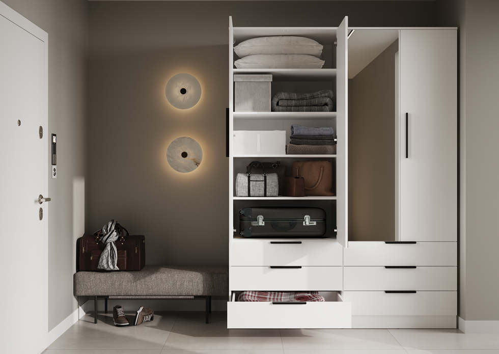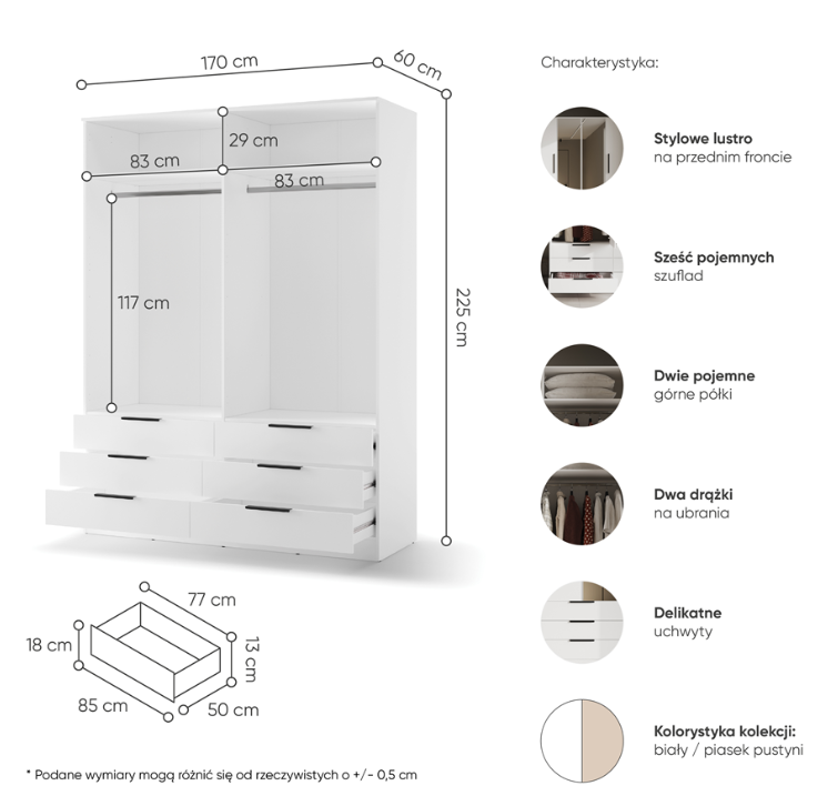 Szafa AVERA AV-01 z lustrem to nowoczesny i pojemny mebel do sypialni, garderoby lub pokoju. Funkcjonalne wnętrze z miejscem na ubrania oraz praktyczne szuflady ułatwiają organizację codziennego przechowywania, a lustro na froncie dodaje wygody i optycznie powiększa przestrzeń.
