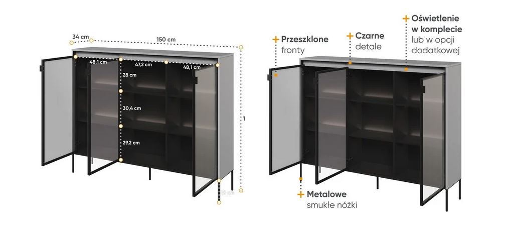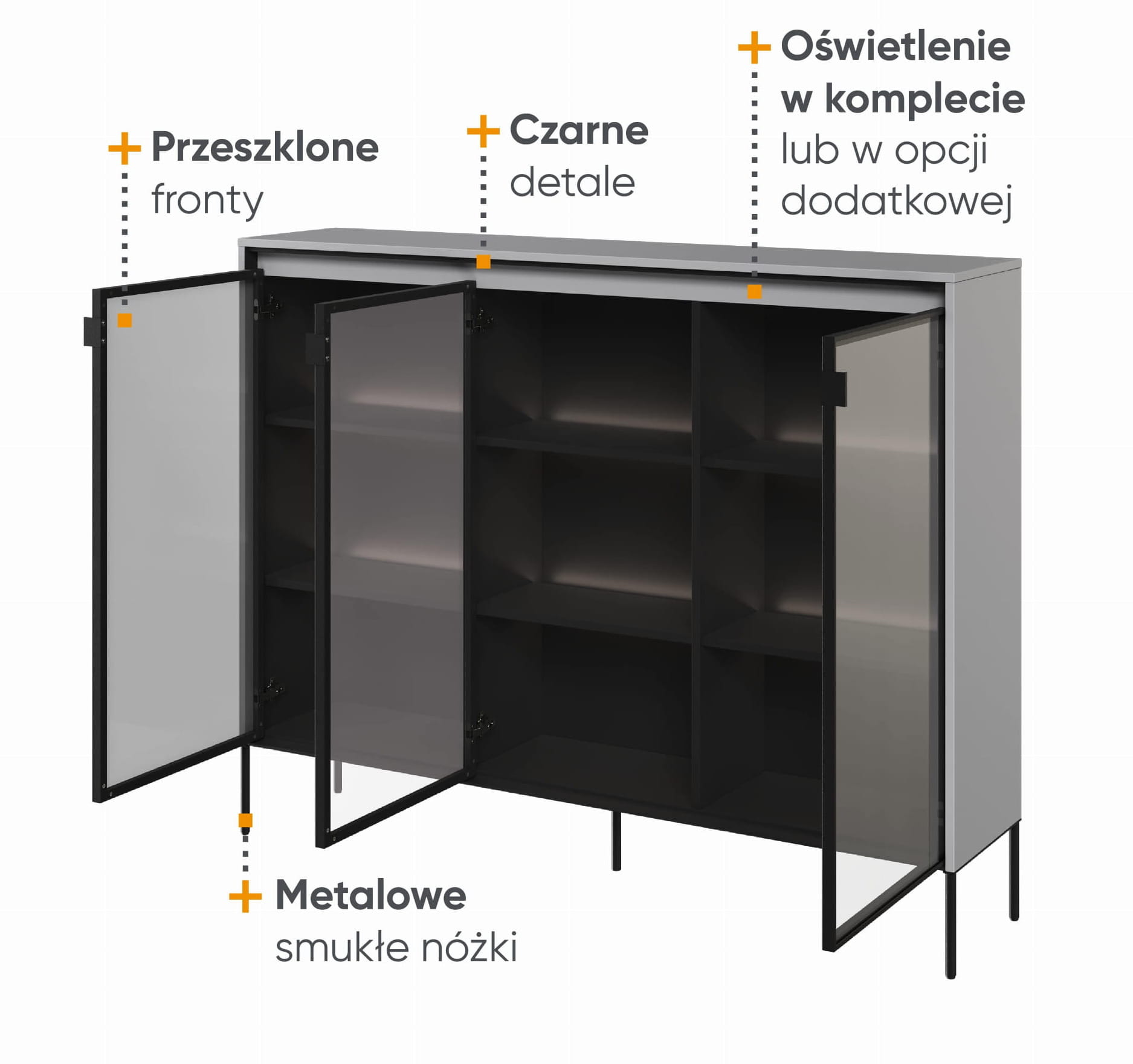 Niska witryna TREND TR-08 to doskonały wybór dla osób szukających eleganckiego sposobu na wyeksponowanie dekoracji. Wyposażona w przeszklone drzwiczki i przestronne półki z wytrzymałej płyty, witryna łączy nowoczesny design z funkcjonalnością. Smukłe nóżki nadają jej lekkości, a pasek LED pod górnym blatem subtelnie oświetla wnętrze. Dodatkowo, możliwość dokupienia oświetlenia LED na półki pozwala na urozmaicenie wyglądu mebla. Witryna doskonale sprawdzi się w salonie, jadalni czy przedpokoju, wprowadzając do wnętrza elegancję i nowoczesny charakter.