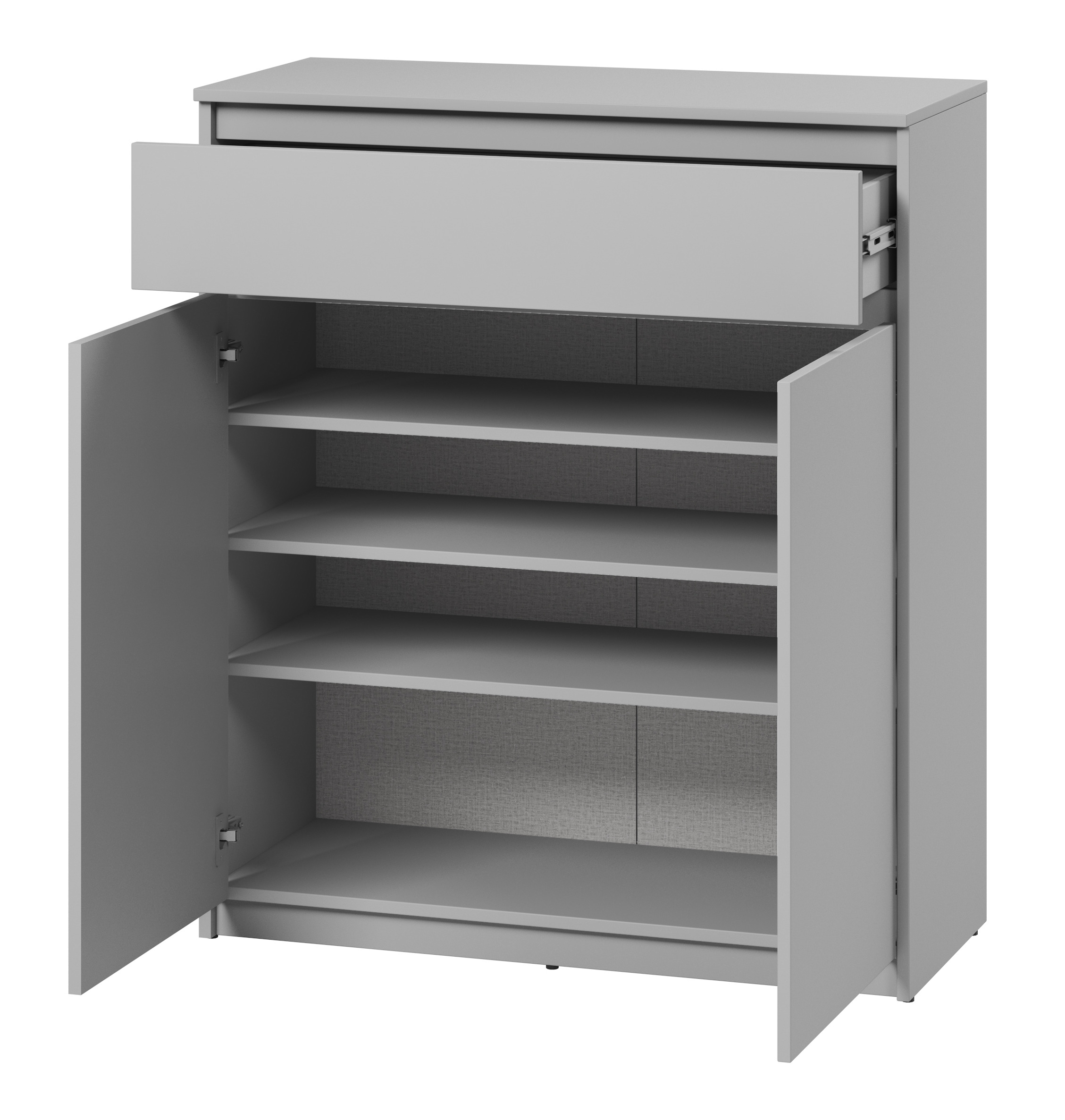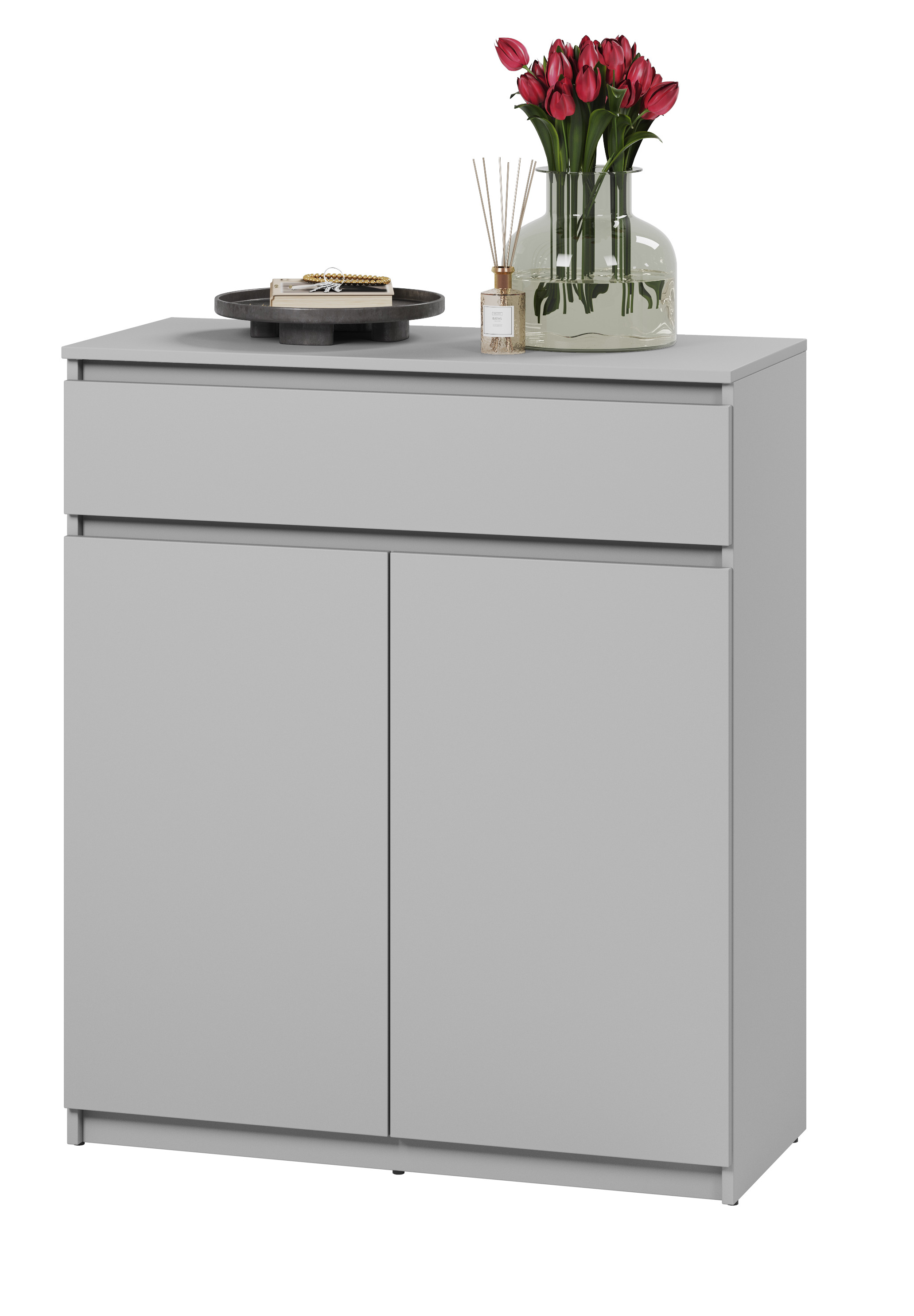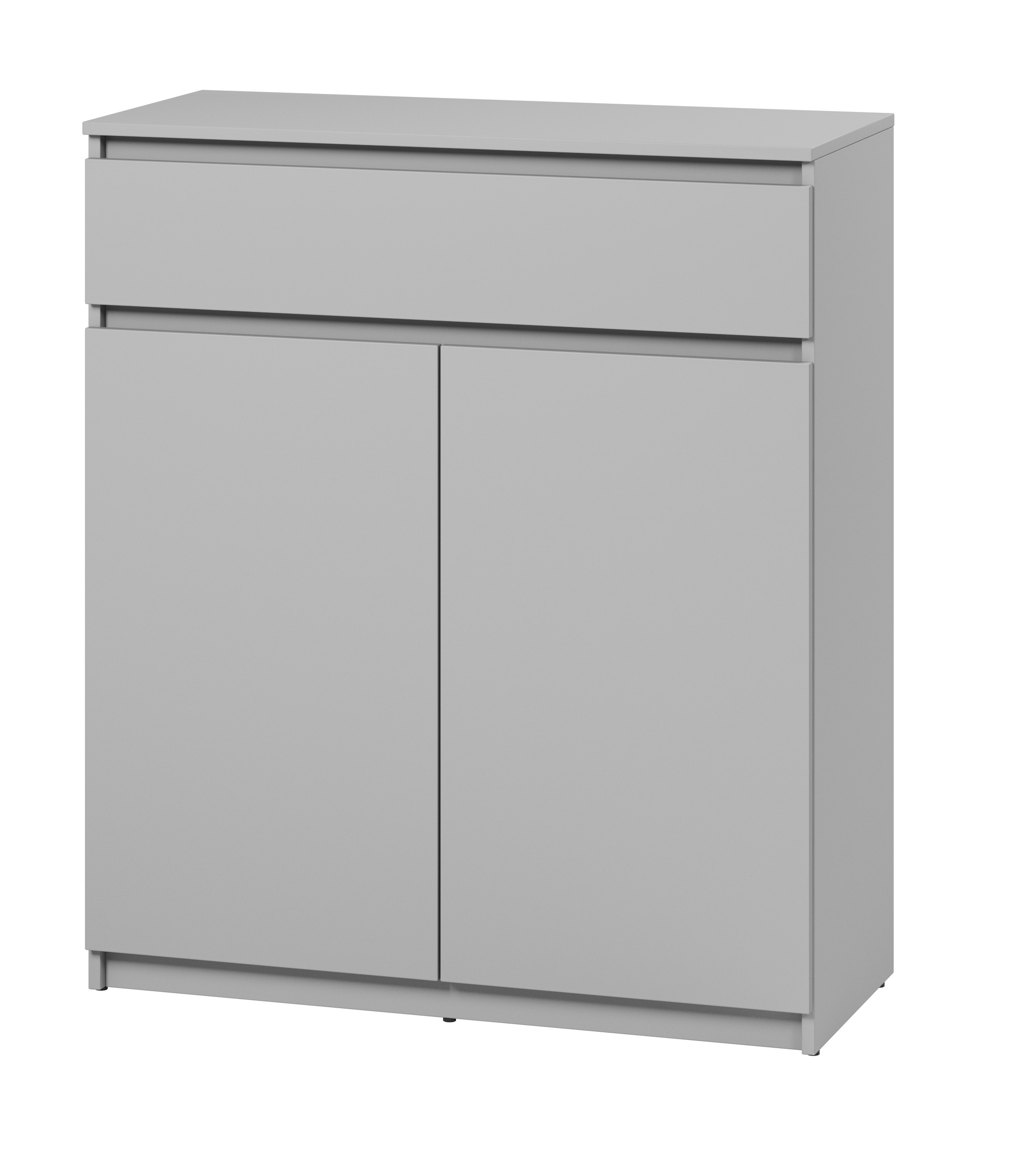 Komoda posiada wysuwaną szufladę idealną na drobne akcesoria oraz trzy pojemne półki za zamykanymi drzwiczkami – idealne na obuwie, tekstylia czy inne domowe niezbędniki. Brak tradycyjnych uchwytów podkreśla nowoczesny, minimalistyczny wygląd mebla, sprawiając, że świetnie wpisuje się w aktualne trendy wnętrzarskie.