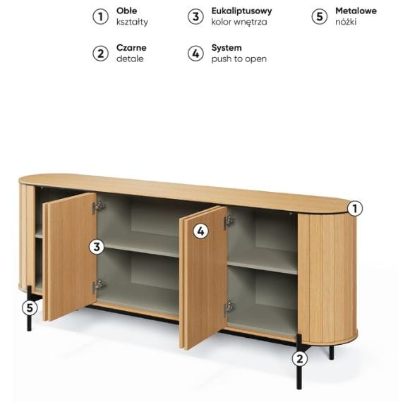 Komoda ROTTO RT-04 to wyjątkowy mebel, który zachwyca swoją nowoczesną formą i funkcjonalnością. O szerokości 200 cm, idealnie wpasowuje się w przestrzenie o współczesnym charakterze, nadając im elegancji i ciepła. Wykonana z wysokiej jakości płyty laminowanej w dwóch subtelnych odcieniach, wprowadza do wnętrza naturalny urok, tworząc przytulną atmosferę w salonie lub jadalni. Komoda wyposażona jest w cztery drzwi, za którymi znajdują się trzy przestronne półki, zapewniające mnóstwo miejsca do przechowywania. Smukłe, czarne metalowe nóżki nadają jej lekkości i nowoczesnego sznytu, podkreślając jej minimalistyczny design.